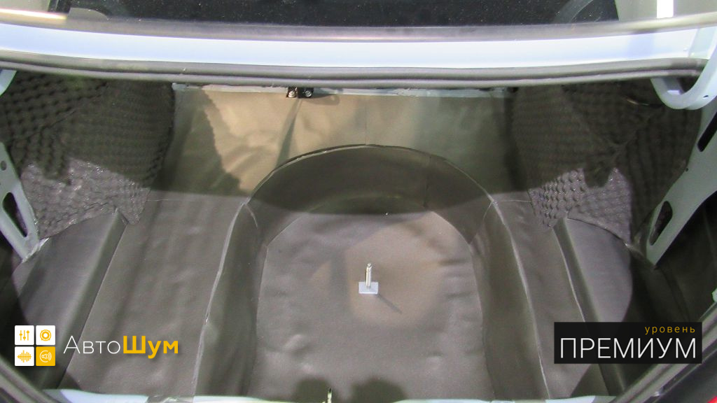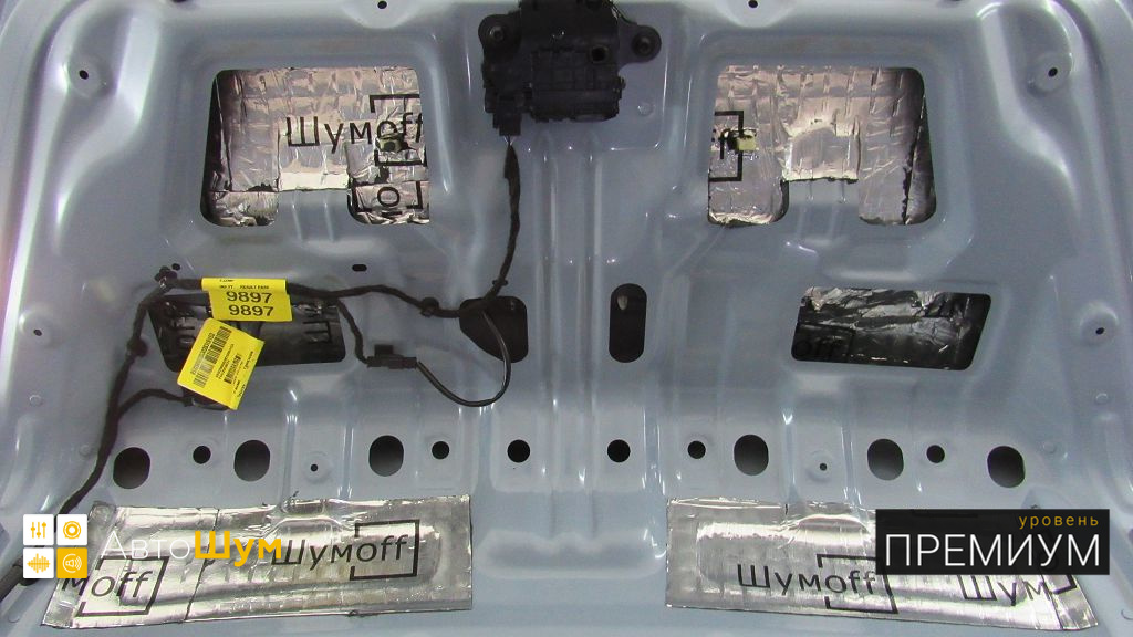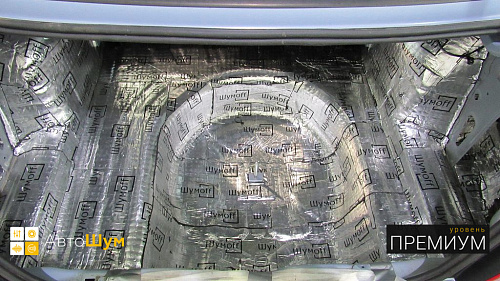 Дно багажника и крылья оклеиваются шумо и теплоизолятором Шумофф П4 4. Арки оклеиваются шумопоглотителем Flex A15.