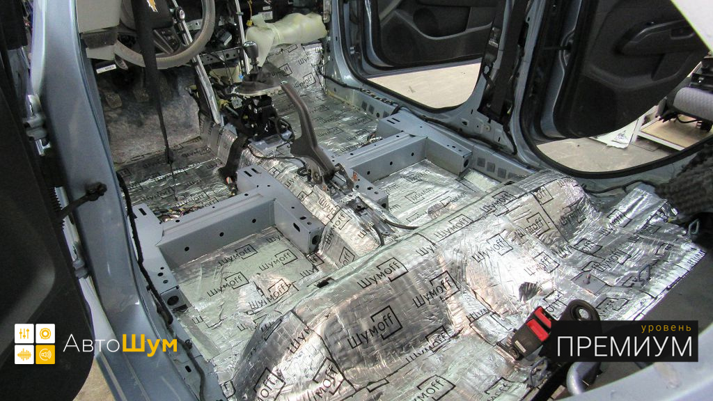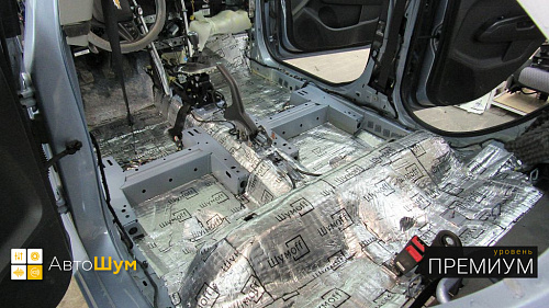 От моторной перегородки и до заднего сиденья вмести с ним клеится мощный многослойный шумо и звукоизолятор Шумофф Prizma 6.