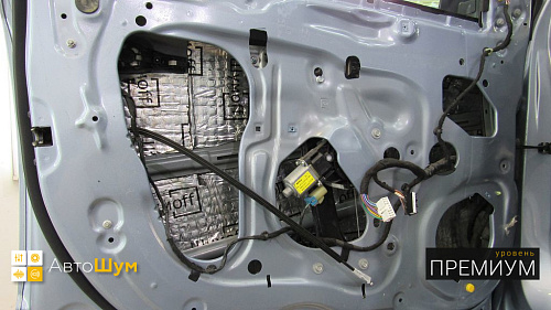 Переходим к дверной обшивке. Убираем штатную шумоизоляцию иобезжириваем поверхность. Всю внутреннюю поверхность оклеиваем мощным шумопоглотителем Шумофф Absorber А15.