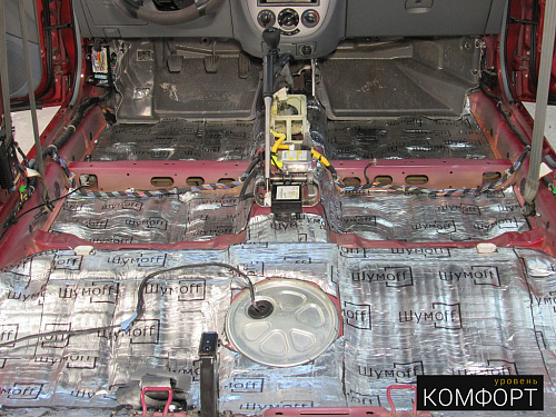 Пол от моторной перегородки и до заднего сиденья оклеивается толстой виброизоляцией Шумофф Super Jack. Под заднее сиденье клеится виброизоляция Шумофф Black Jack.