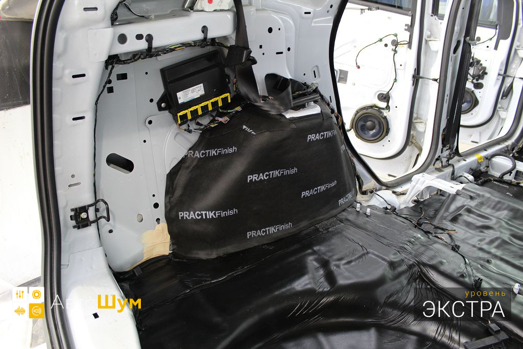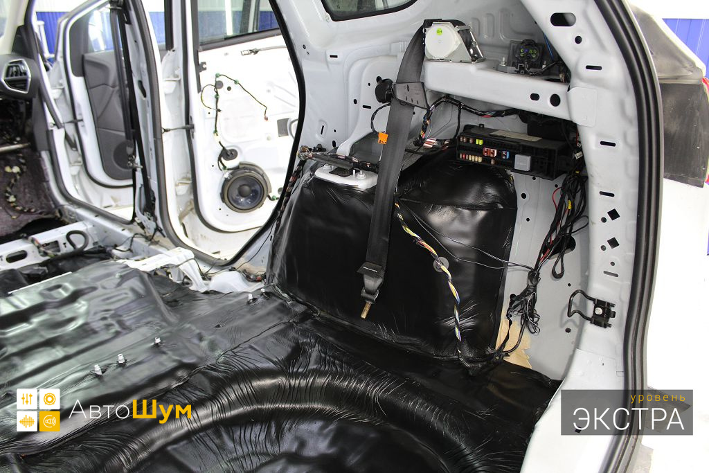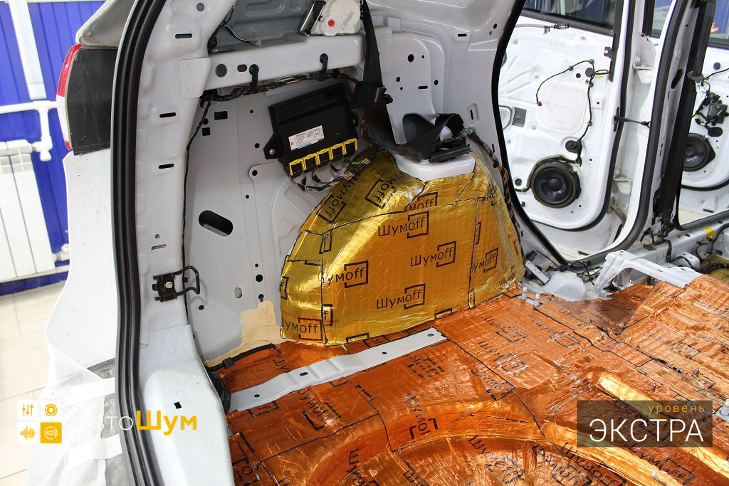 Дно багажника и крылья оклеиваются шумо и теплоизолятором Шумофф П4 4. Арки оклеиваются шумопоглотителем Flex A15.