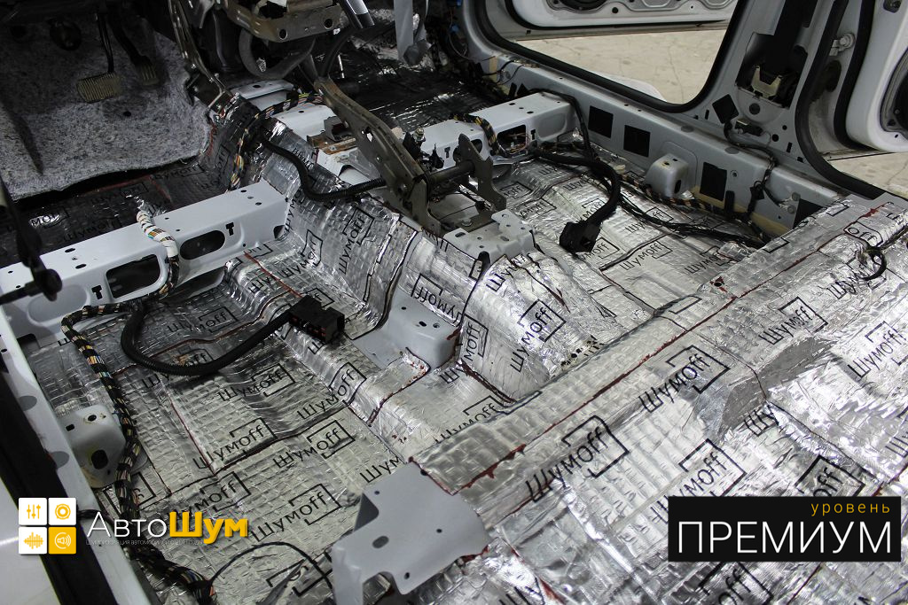 От моторной перегородки и до заднего сиденья вмести с ним клеится мощный многослойный шумо и звукоизолятор Шумофф Prizma 6.