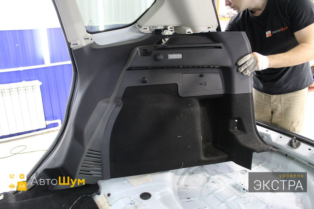 Обезжириваем поверхность и приступаем к монтажу второго слоя. Также для получения более эффективного результата используем компоновку из двух материалов На дно багажника клеим Шумофф Base 4. Этот слой позволит снизить нам шум от дороги.
