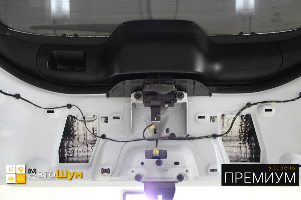 Обшивку пятой двери изнутри оклеиваем так же мощным шумопоглотителем Absorber А15, а по её контуру антискрипным материалом. Тем самым мы помимо еще одного барьера от внешнего шума устраняем возможность всех скрипов и бряков.