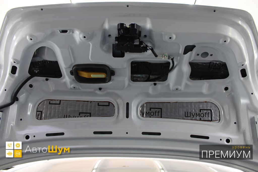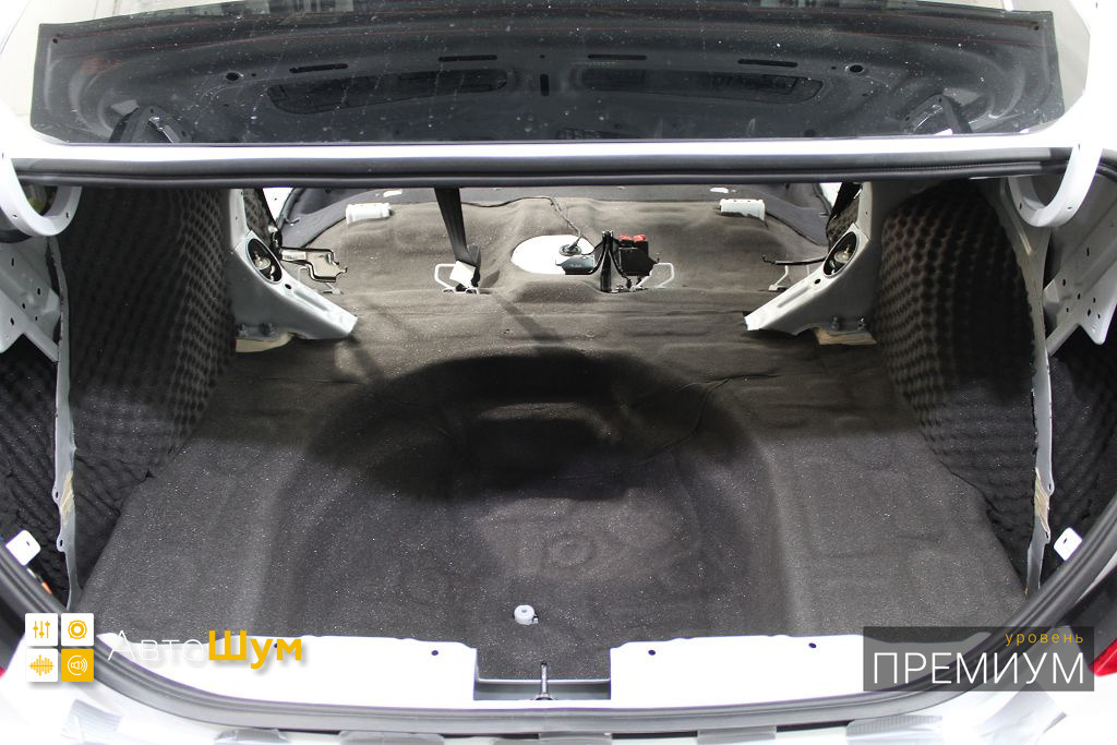 На арки клеим также Шумофф М3, а для крыльев используем менее тяжелый М2. Оклеиваем максимальную площадь багажника за исключением усилителей и ребер жесткости. Данная компоновка материалов позволит идеально достичь нужной эффективности при минимальном увеличении веса, что вместе с виброизоляцией пола также поможет нам снизить вибрацию от дороги, увеличить целостность и сбитость авто.