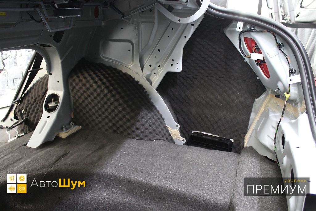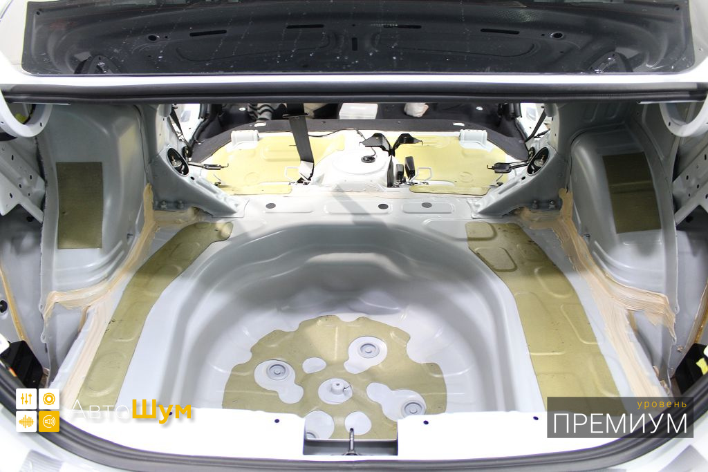 Обезжириваем поверхность и приступаем к монтажу второго слоя. Также для получения более эффективного результата используем компоновку из двух материалов На дно багажника клеим Шумофф Base 4. Этот слой позволит снизить нам шум от дороги.
