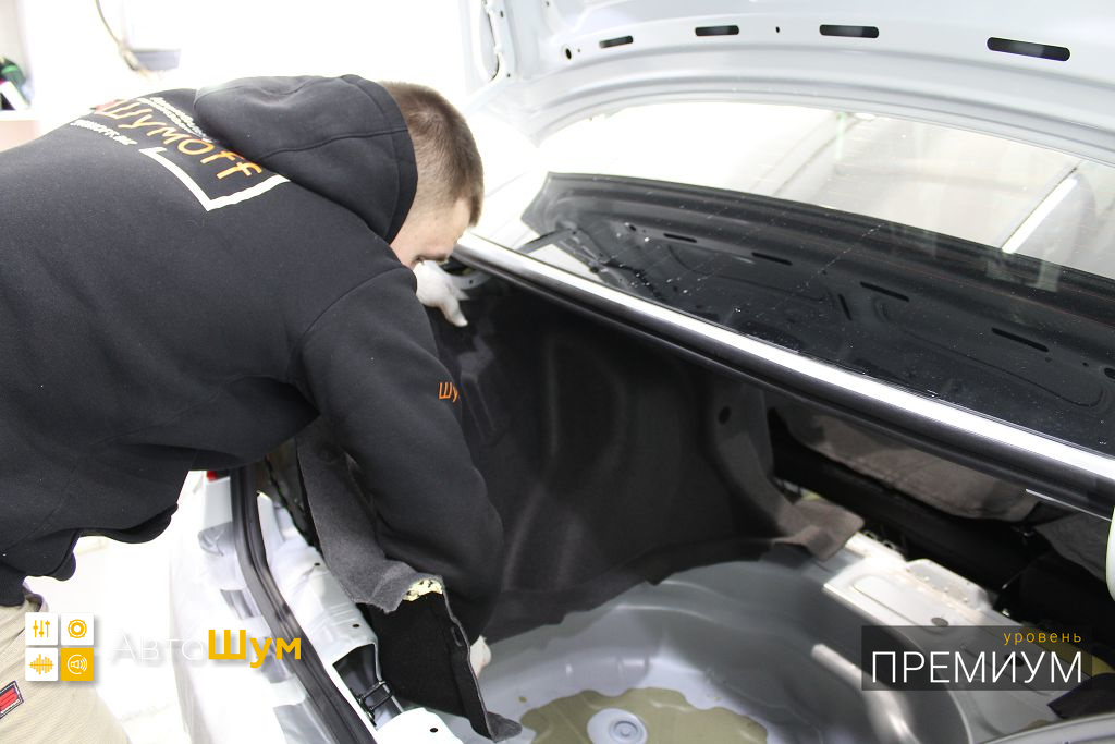 - все дно багажника и крылья оклеиваем мене толстым и тяжелым Шумофф М3.