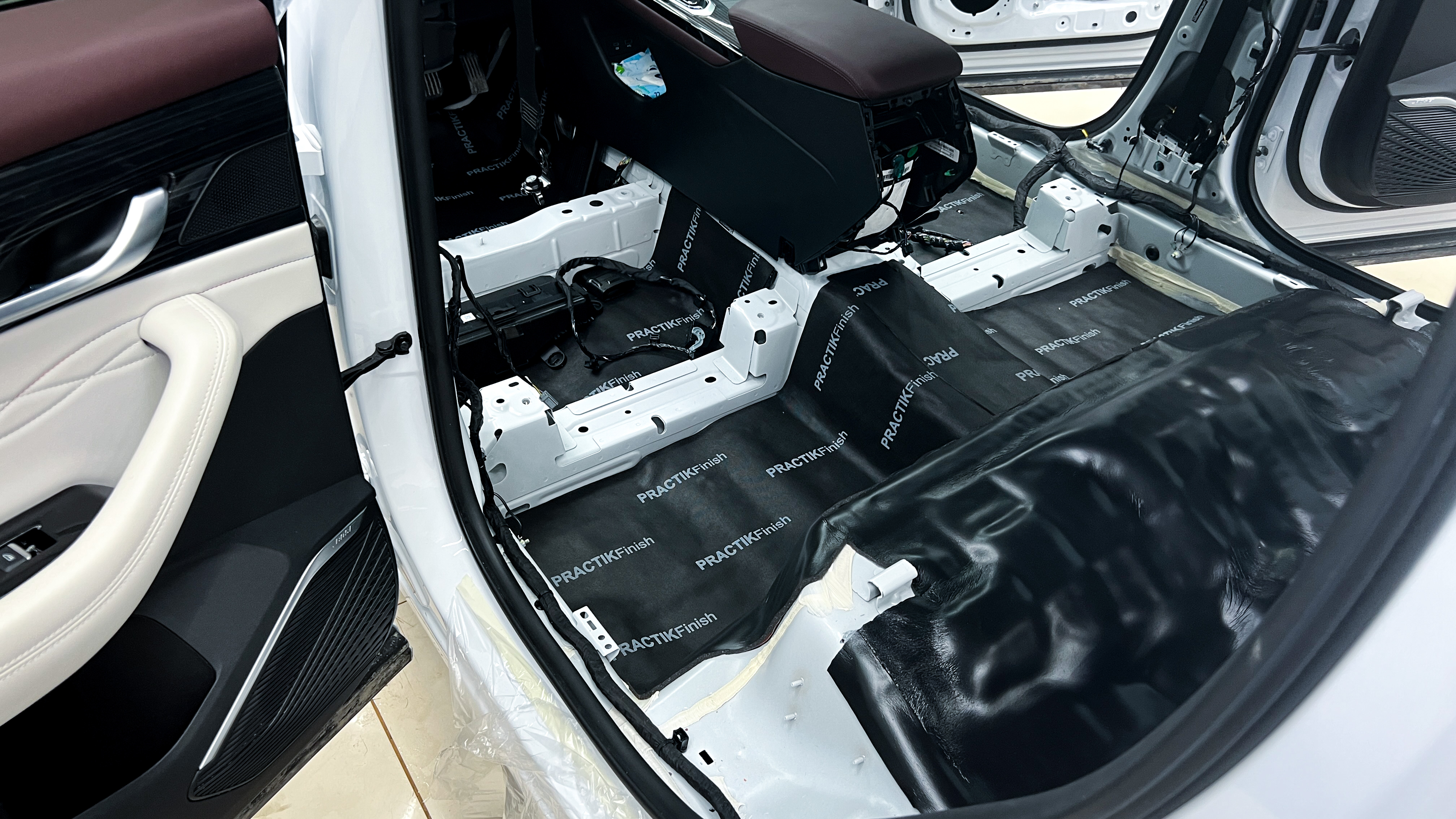 Шумоизоляция пола Джили Монжаро Вторым слоем поверх M4 клеим шумопоглотитель с черным влагозащитным покрытием Шумофф Герметон 7Л.