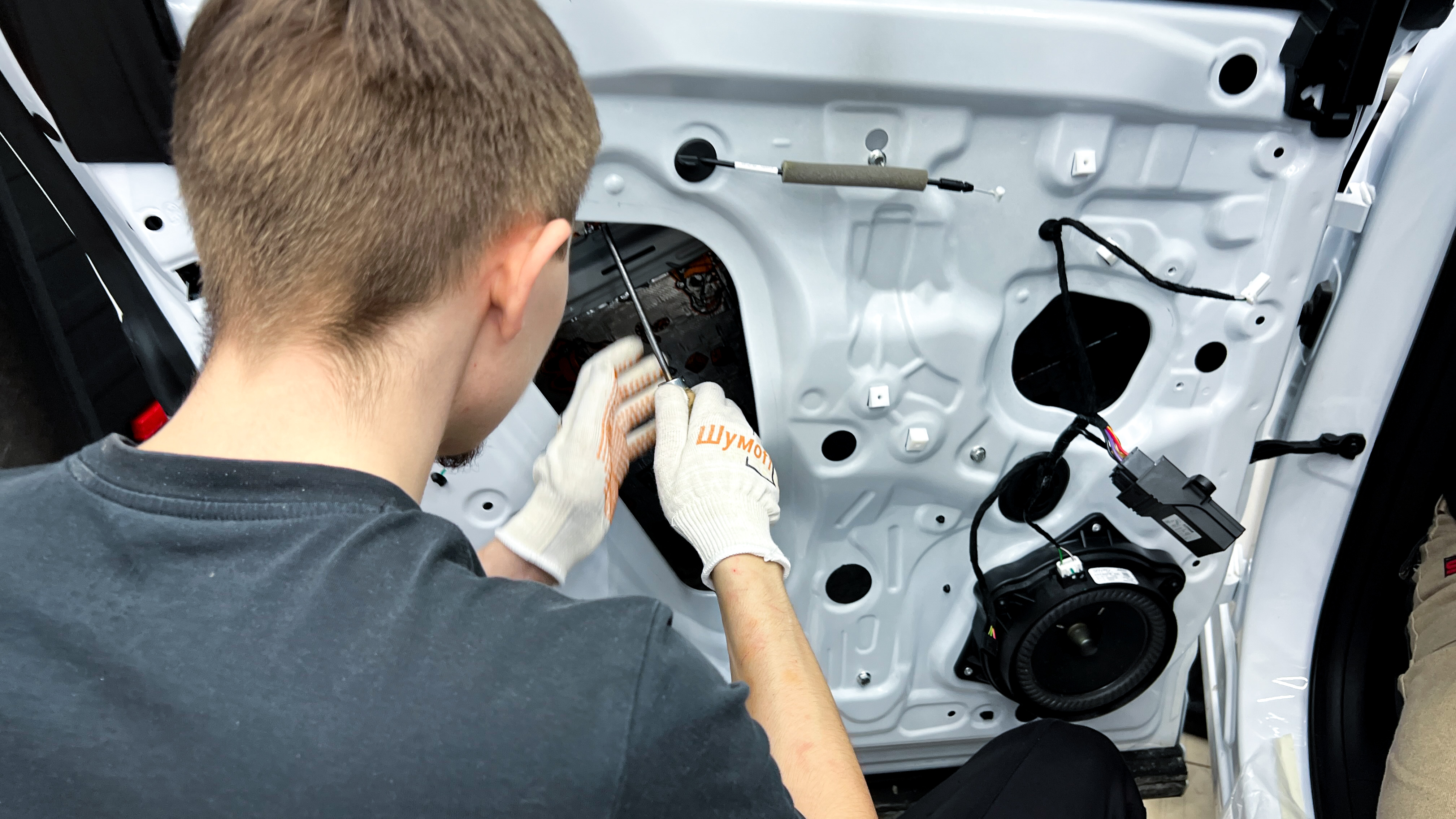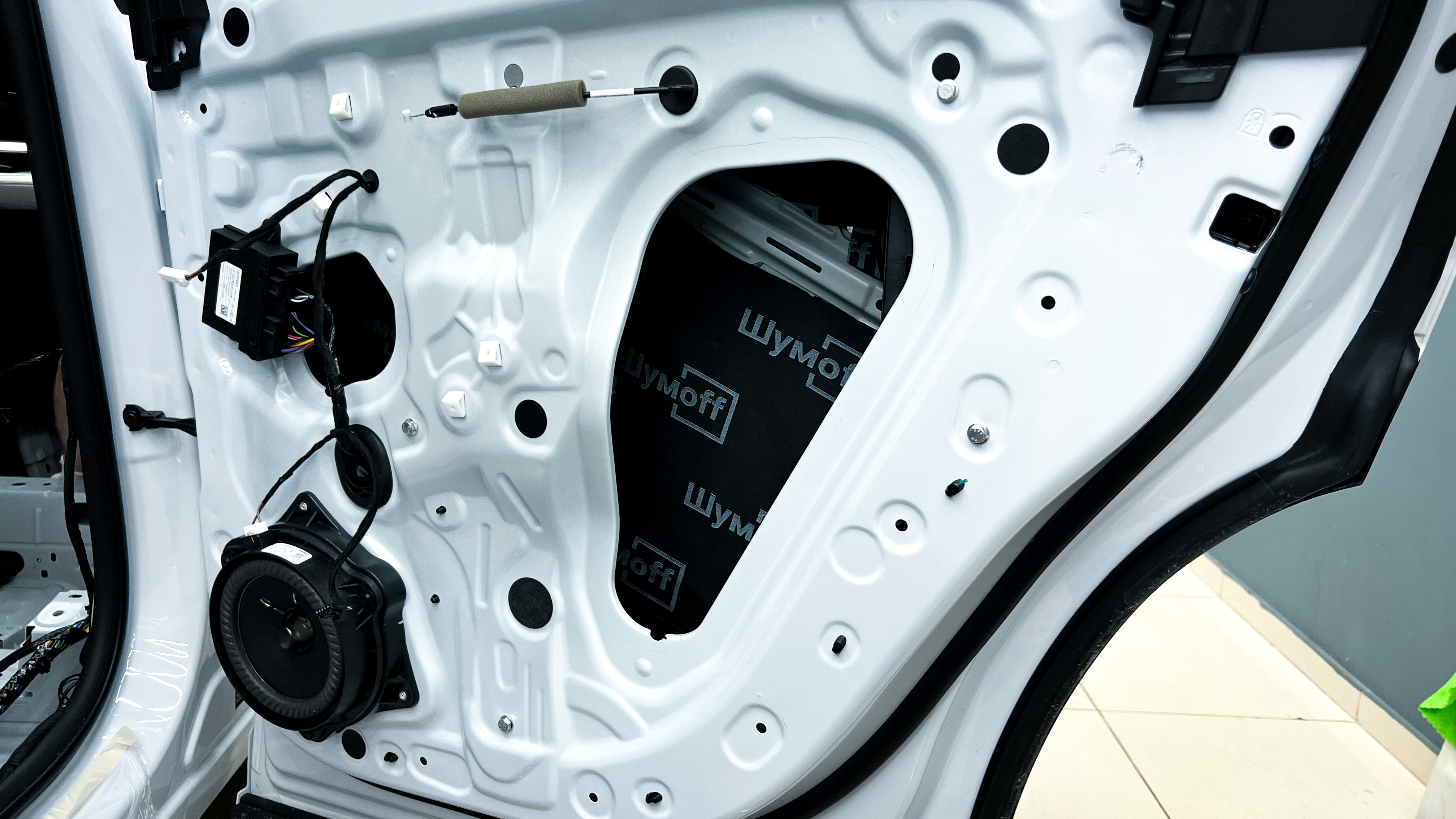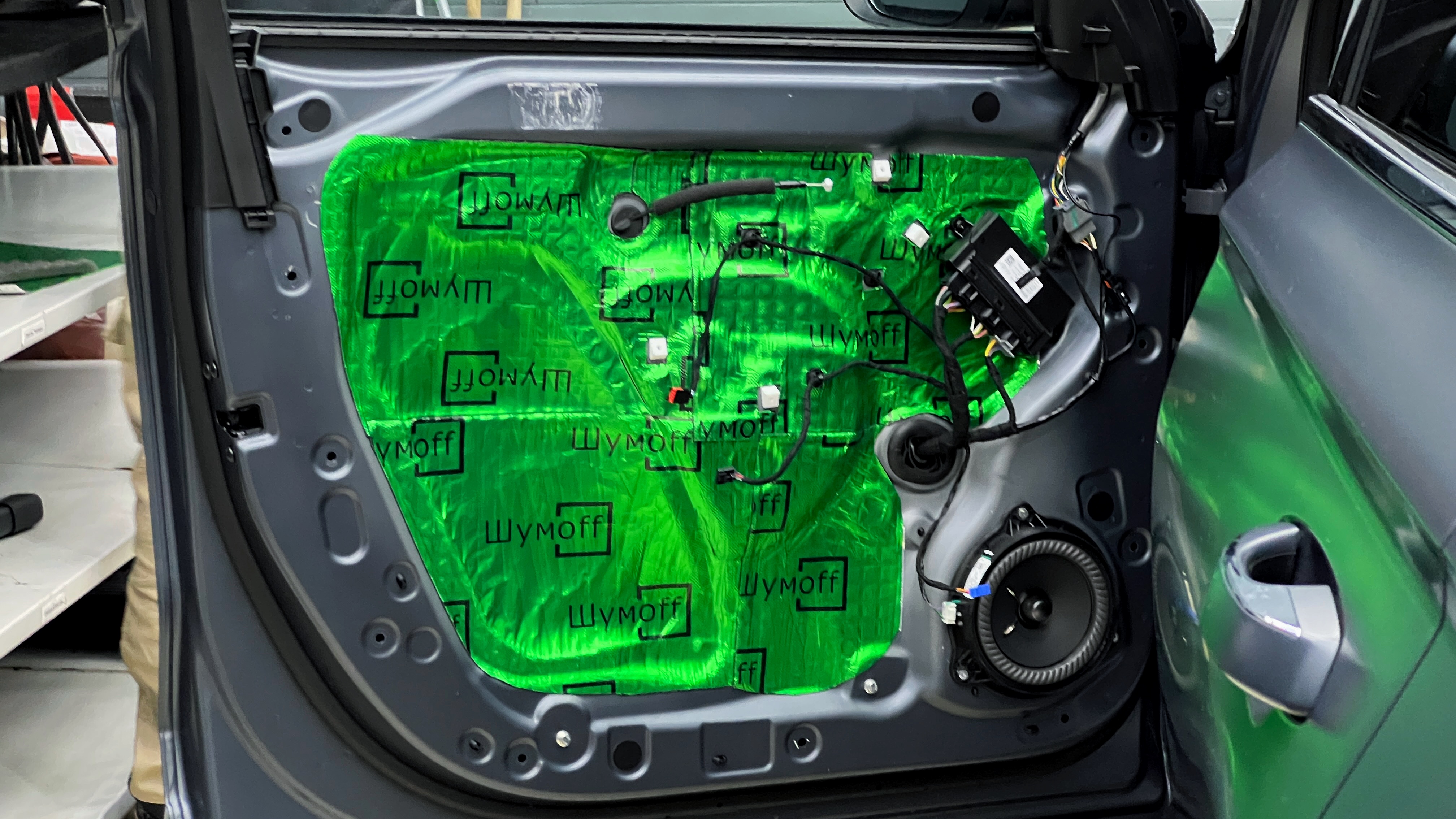 Виброизоляция двери Джили Монжаро Первым слоем на внутреннюю часть двери клеим виброизоляцию Шумофф М2. Этот слой поможет нам улучшить звучание акустики, а также сделать закрывание дверей более приятным.