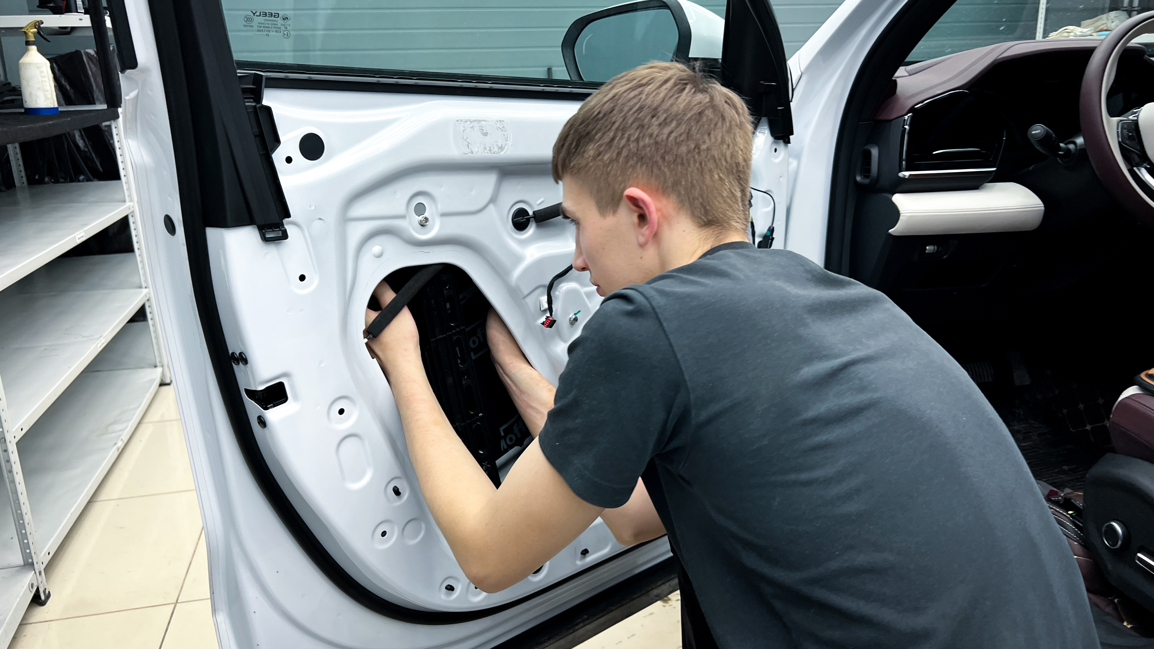 Оклейка технологических отверстий двери Джили Монжаро Для третьего слоя на технологические отверстия используем так же Joker. Данная совокупность слоёв улучшат звучание акустики, а также засчет увеличения массы двери будут закрываться более четко, тихо и плотно.