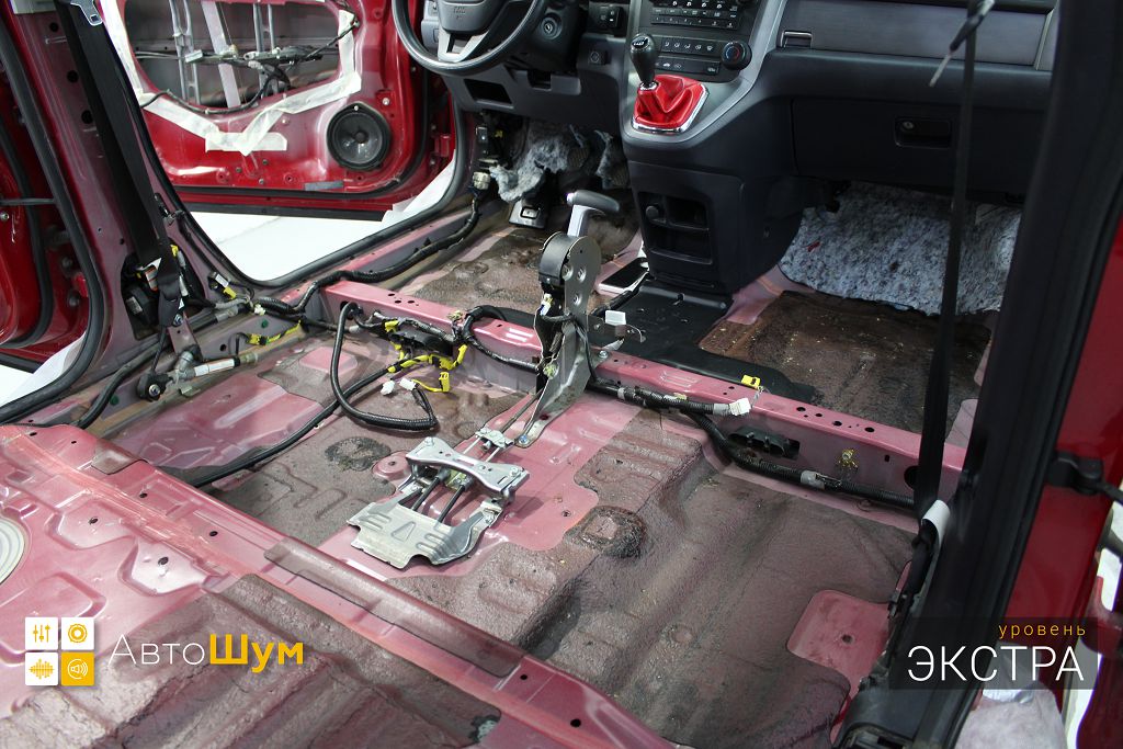 Перед началом шумоизоляции пола на Honda CR-V 4 (Хонда ЦР-В 4);необходимо проверить качество адгезии заводской виброизоляции к кузову. Она должна хорошо держаться, в противном, случае её необходимо демонтировать.