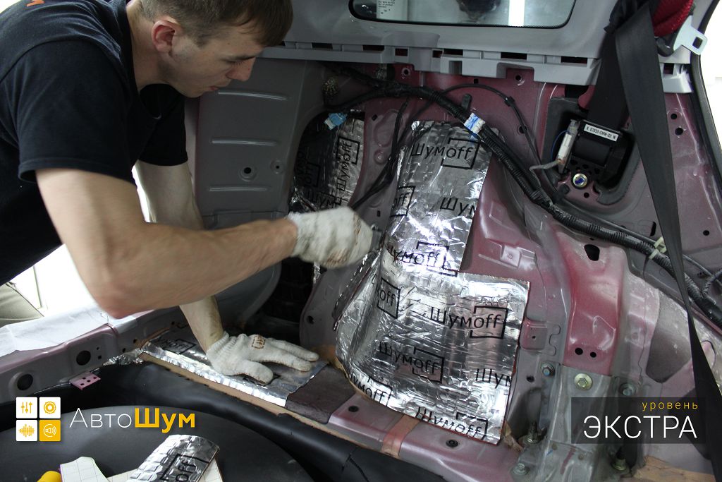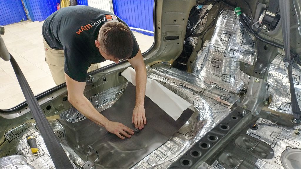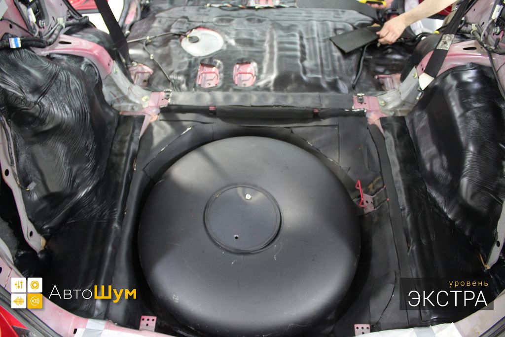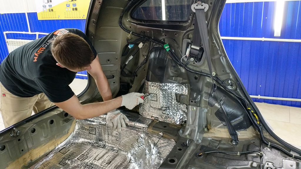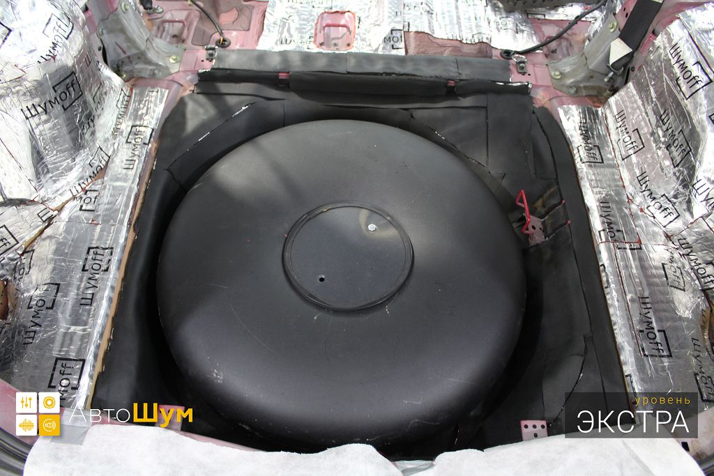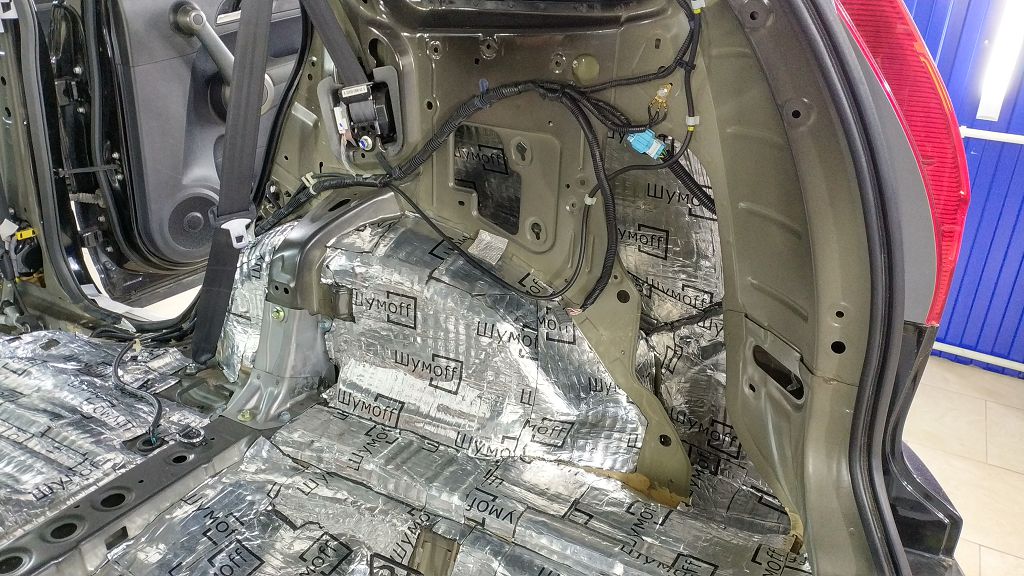 Дно багажника и крылья оклеиваются шумо и теплоизолятором Шумофф П4 4. Арки оклеиваются шумопоглотителем Flex A15.