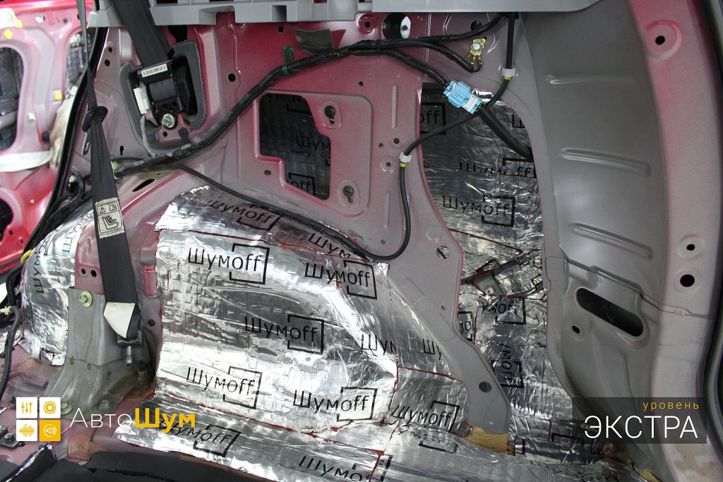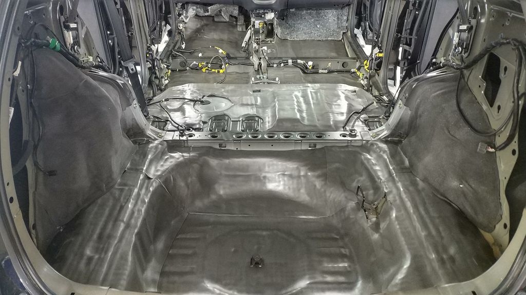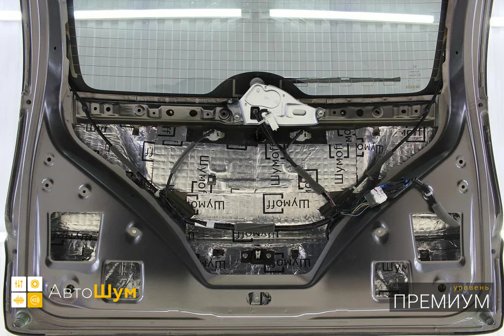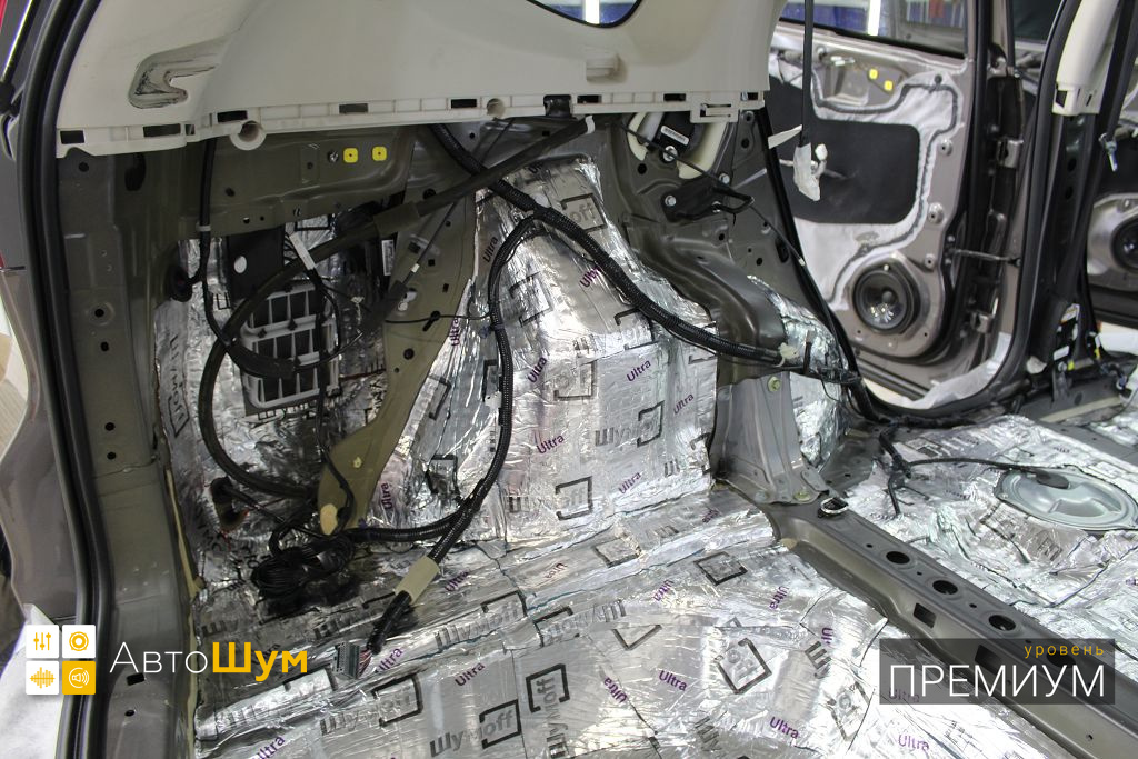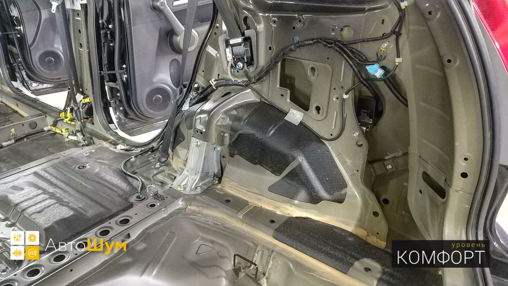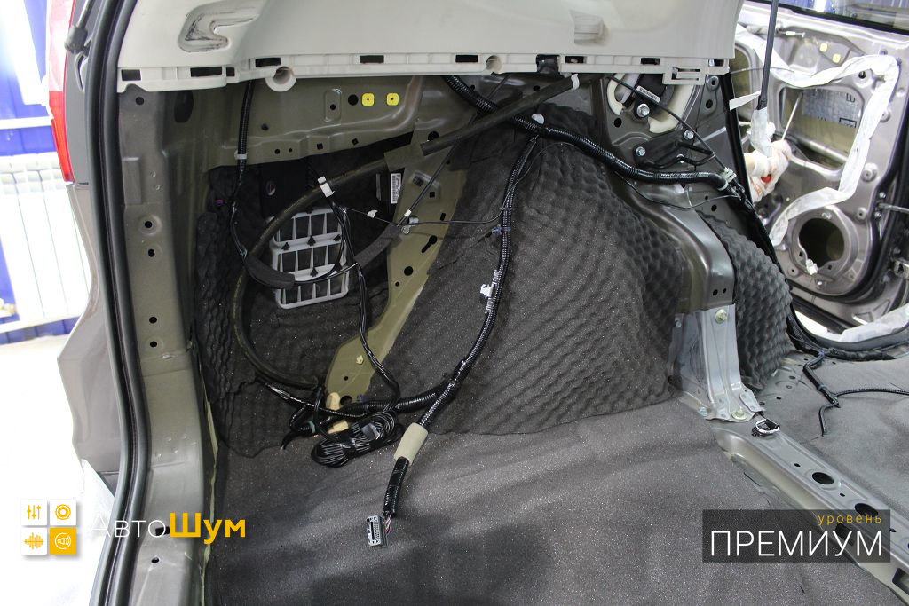 Дно багажника и крылья оклеиваются шумо и теплоизолятором Шумофф П4 4. Арки оклеиваются шумопоглотителем Flex A15.