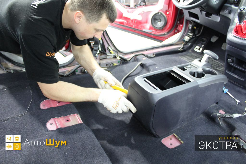Приступаем к разборке остальной части салона, откручиваем и вынимаем сиденья, центральную консоль и ковер.