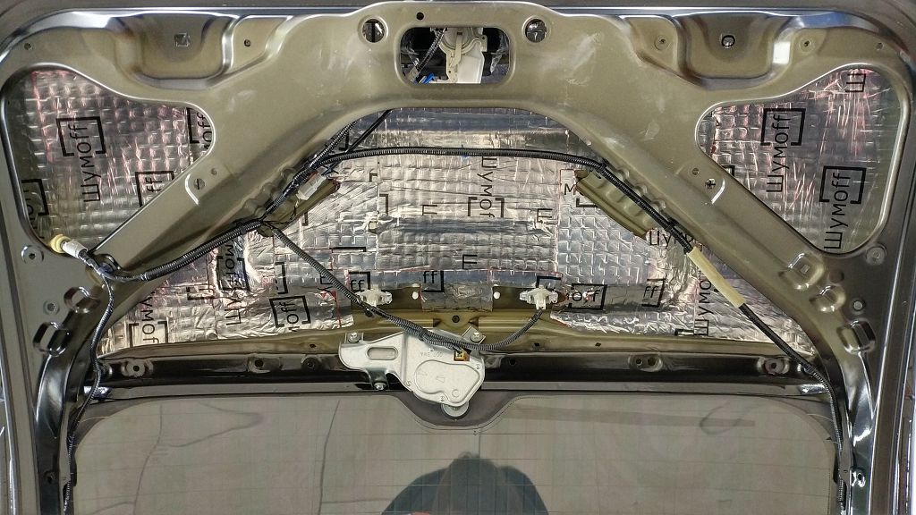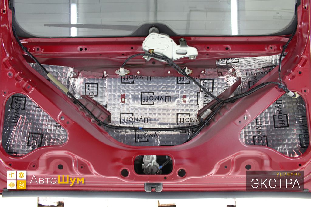 Обшивку пятой двери оклеиваем Flex А15, для устранения ненужных скрипов и бряков.