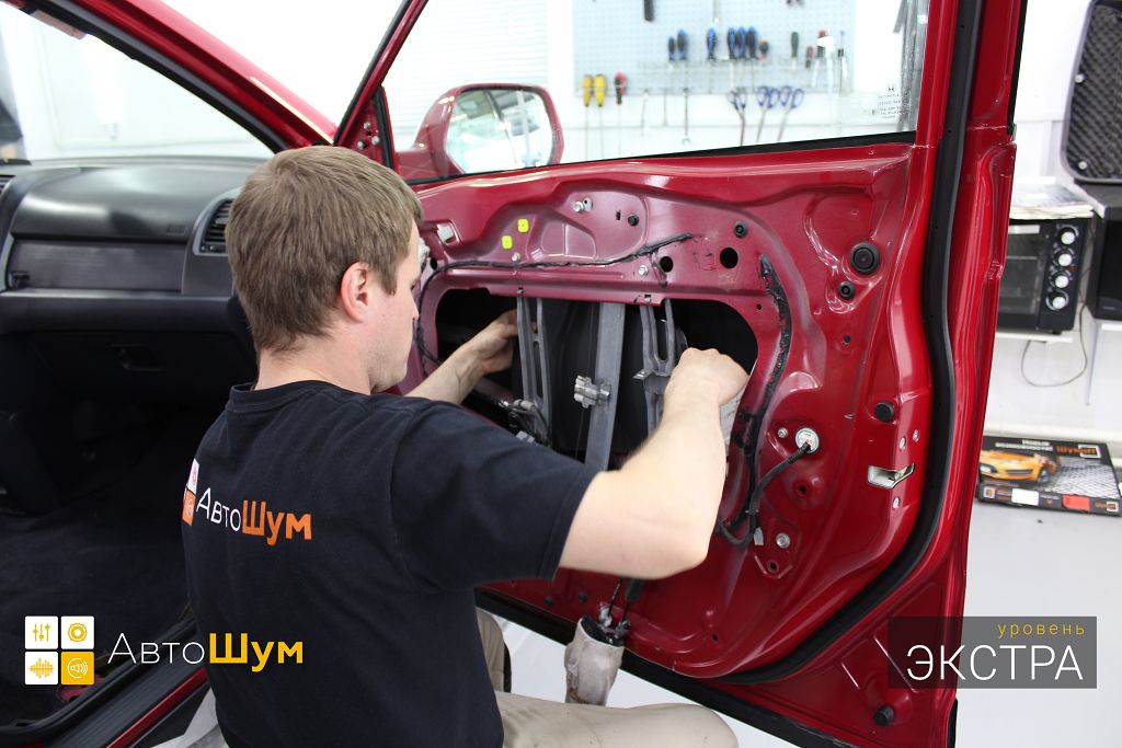 Приступаем к шумоизоляции дверей Honda CR-V (Хонда СР-В). Разбираем все дверные обшивки. Убираем их на специальный стеллаж, чтобы не повредить.