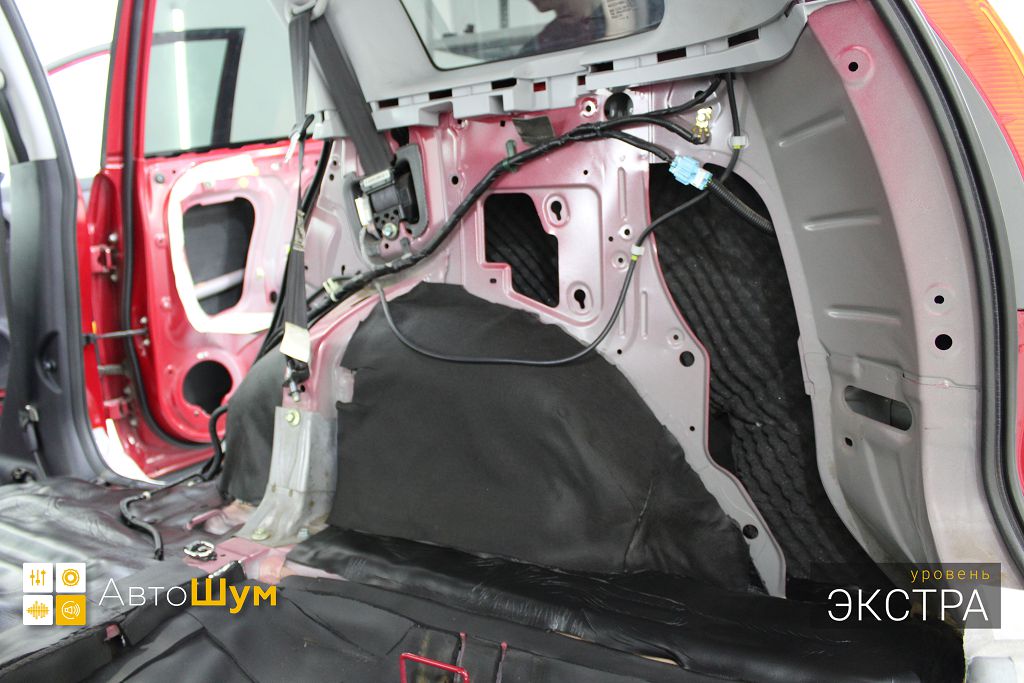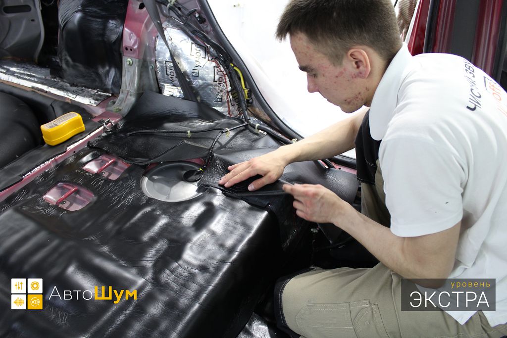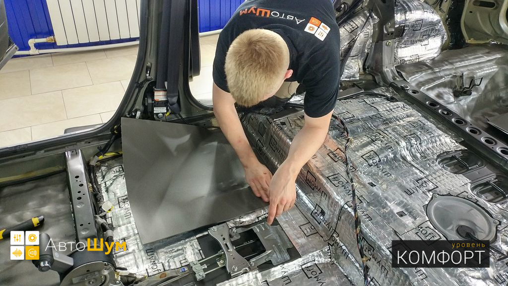 Под заднее сиденье монтируем более тонкий Герметон 7.На арки же наносится шумопоглотитель Absorber А15.