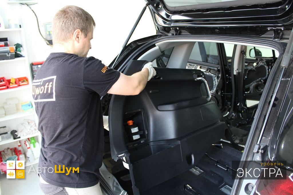 Обезжириваем поверхность и приступаем к монтажу второго слоя. Также для получения более эффективного результата используем компоновку из двух материалов На дно багажника клеим Шумофф Base 4. Этот слой позволит снизить нам шум от дороги.