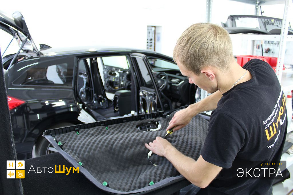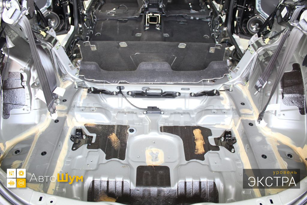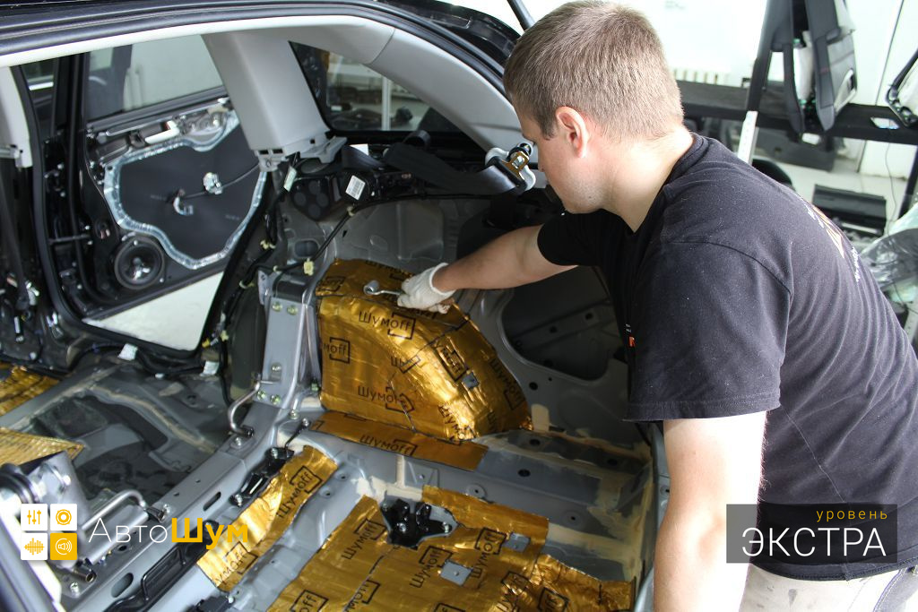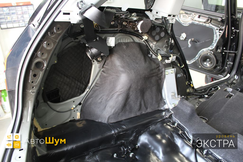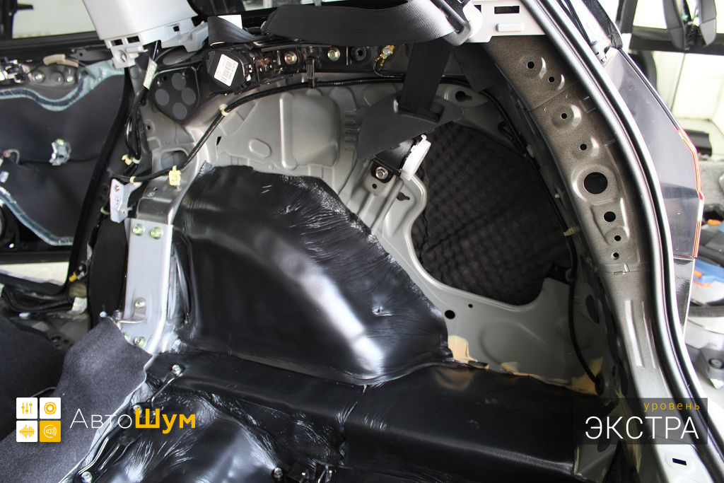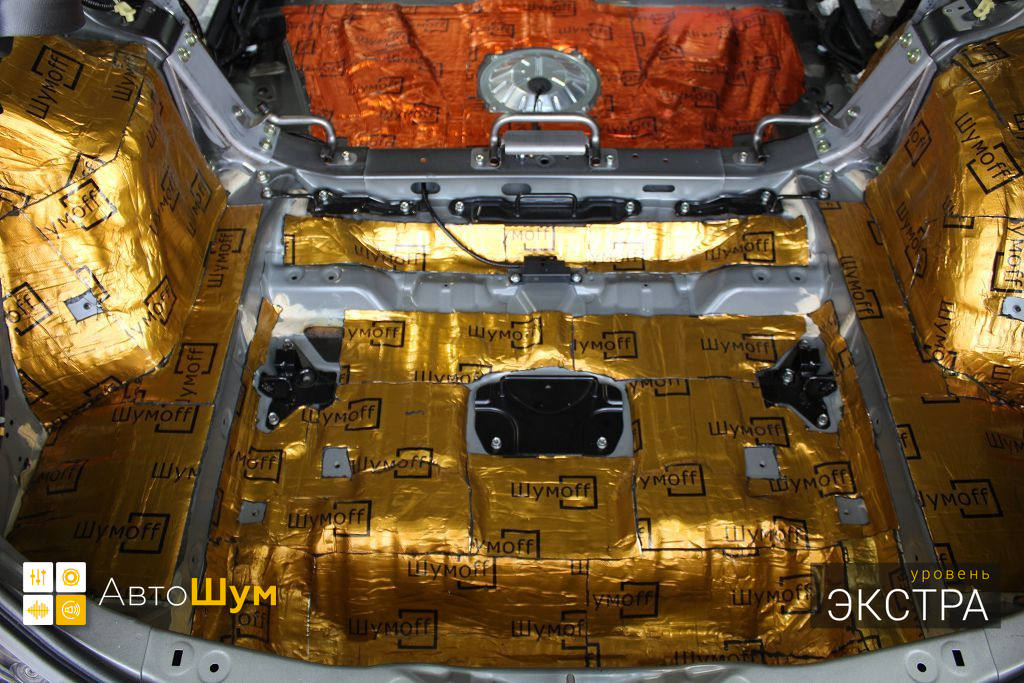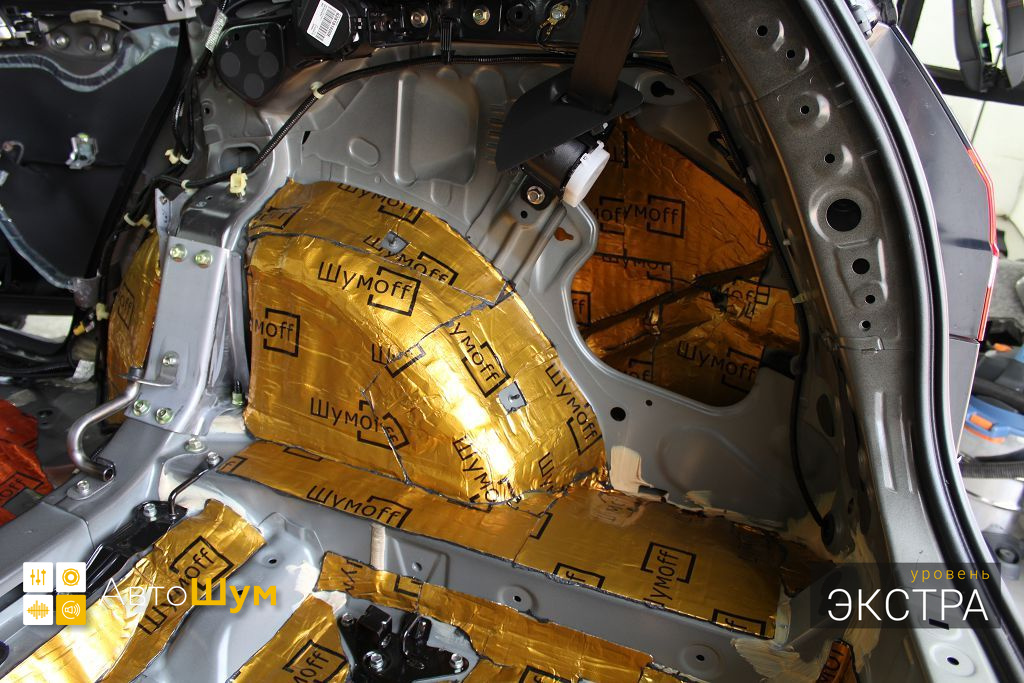 Дно багажника и крылья оклеиваются шумо и теплоизолятором Шумофф П4 4. Арки оклеиваются шумопоглотителем Flex A15.