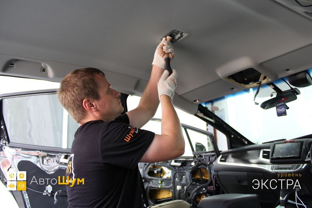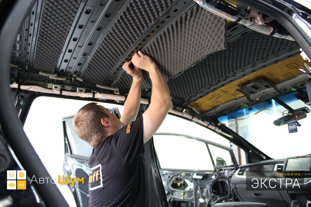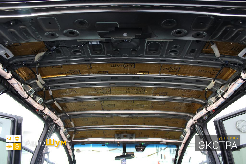 От моторной перегородки и до заднего сиденья вмести с ним клеится мощный многослойный шумо и звукоизолятор Шумофф Prizma 6.