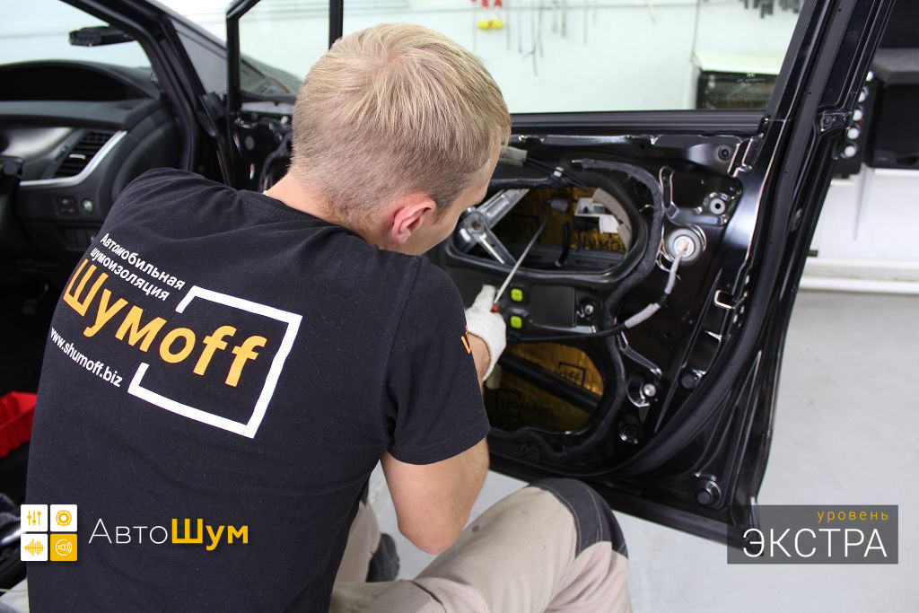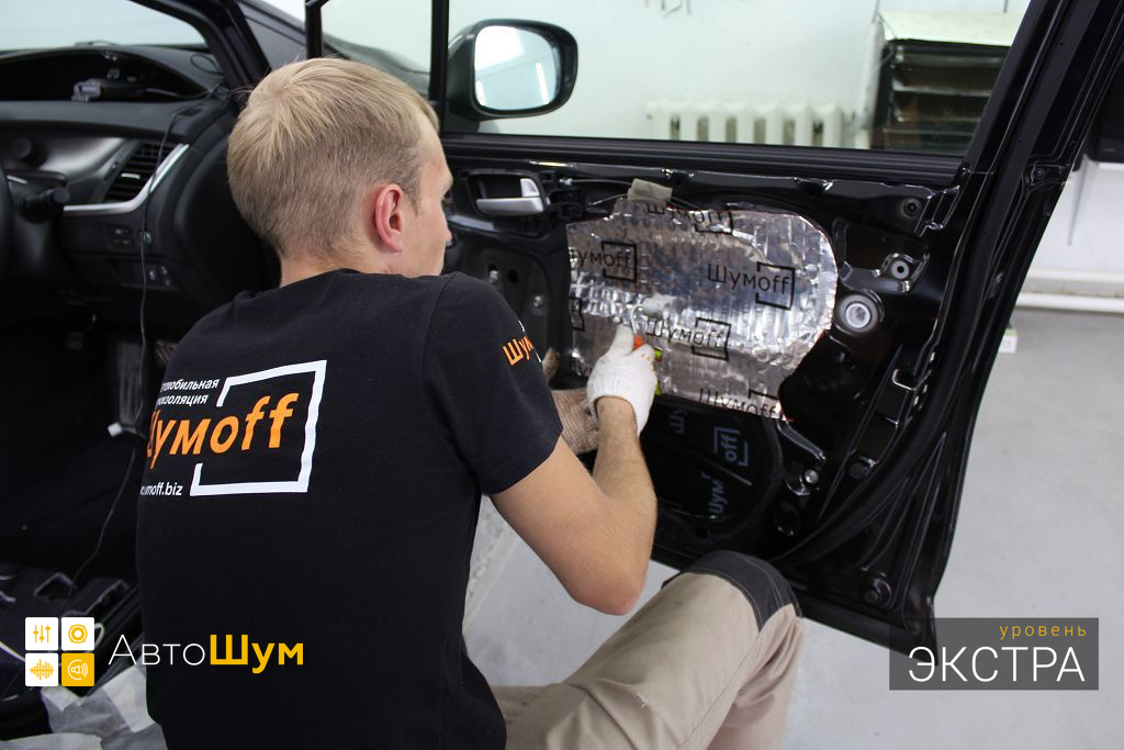 Переходим к дверной обшивке. Убираем штатную шумоизоляцию и обезжириваем поверхность. Монтируем виброизоляцию Шумофф Joker.
