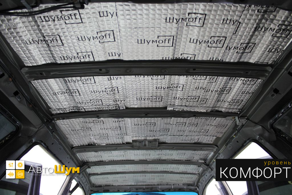 Вторым слоем поверх виброизоляции клеим на крышу современный и очень эффективный шумопоглотитель Шумофф Absorber А15.