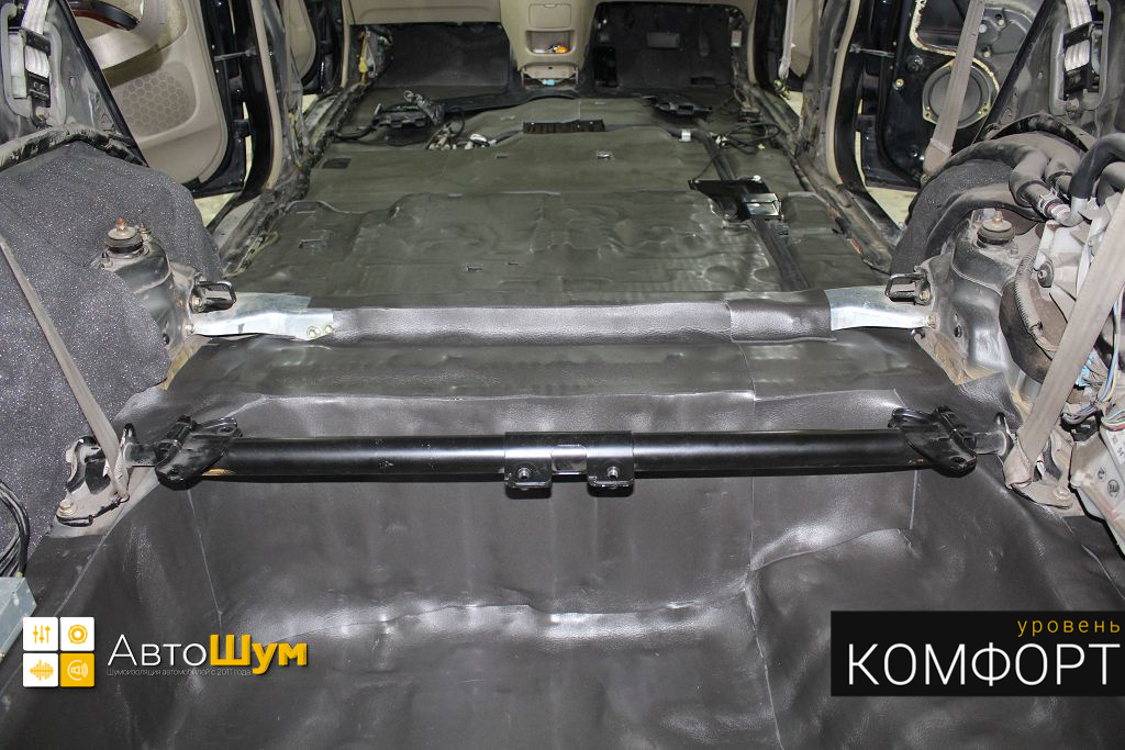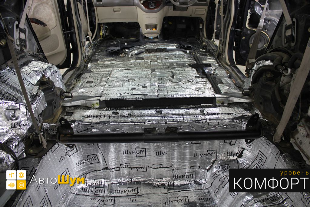 От моторной перегородки и до заднего сиденья вмести с ним клеится мощный многослойный шумо и звукоизолятор Шумофф Prizma 6.