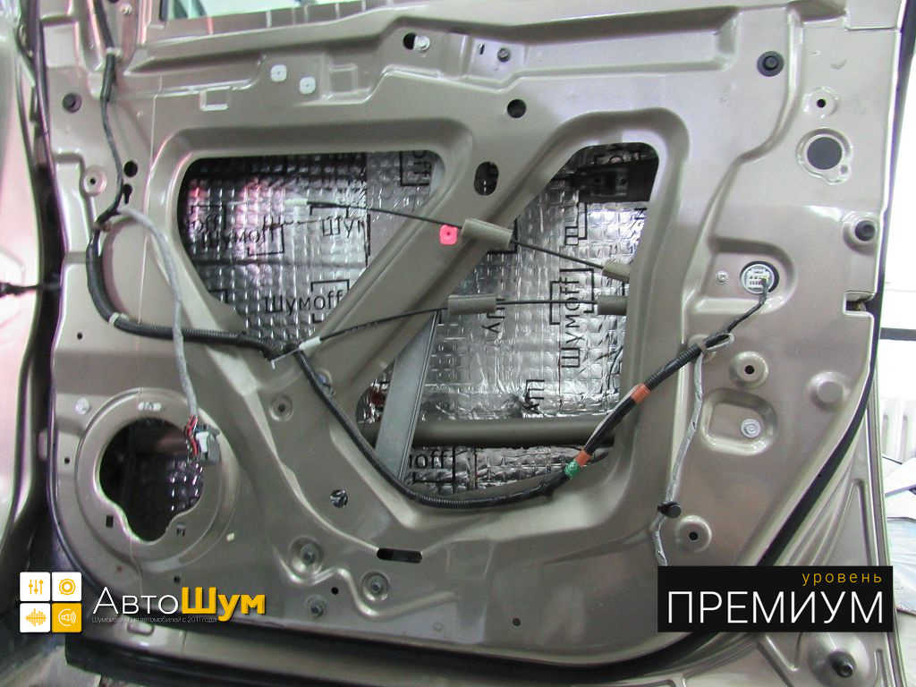 Переходим к дверной обшивке. Убираем штатную шумоизоляцию и обезжириваем поверхность. Всю внутреннюю поверхность оклеиваем мощным шумопоглотителем Шумофф Absorber А15.