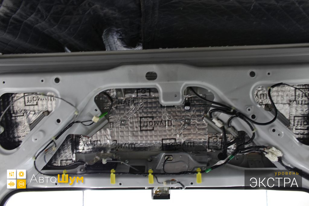 Обшивку пятой двери оклеиваем Flex А15, для устранения ненужных скрипов и бряков.