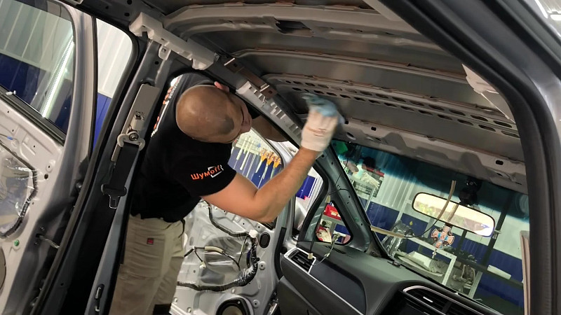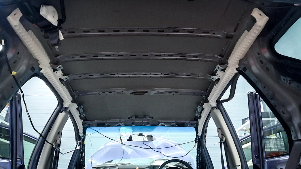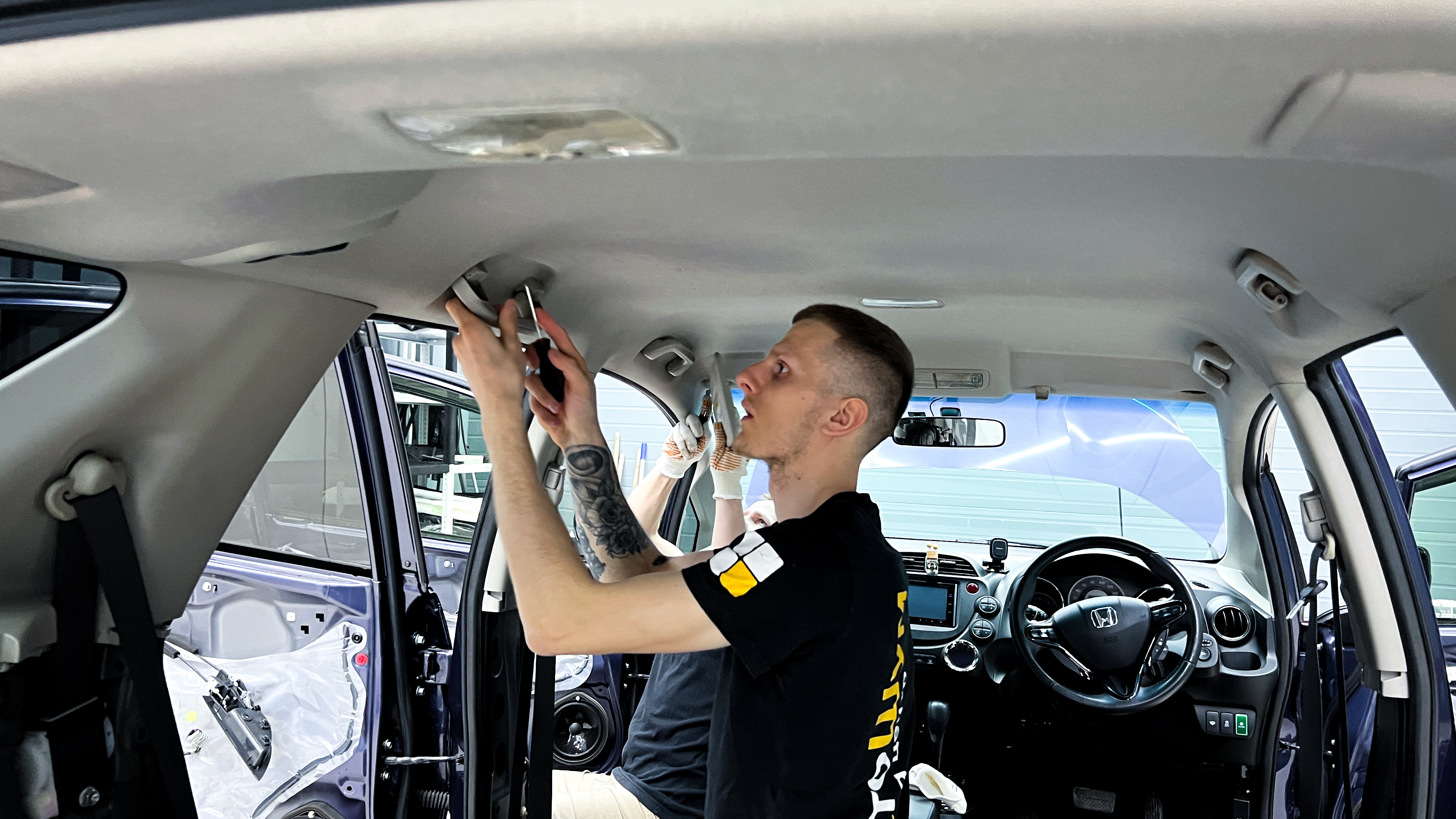 Штатная шумоизоляция крыши на Honda Fit Shuttle (Хонда Фит Шатл) полностью отсутствует. Обезжириваем поверхность для начала монтажа виброизоляции.