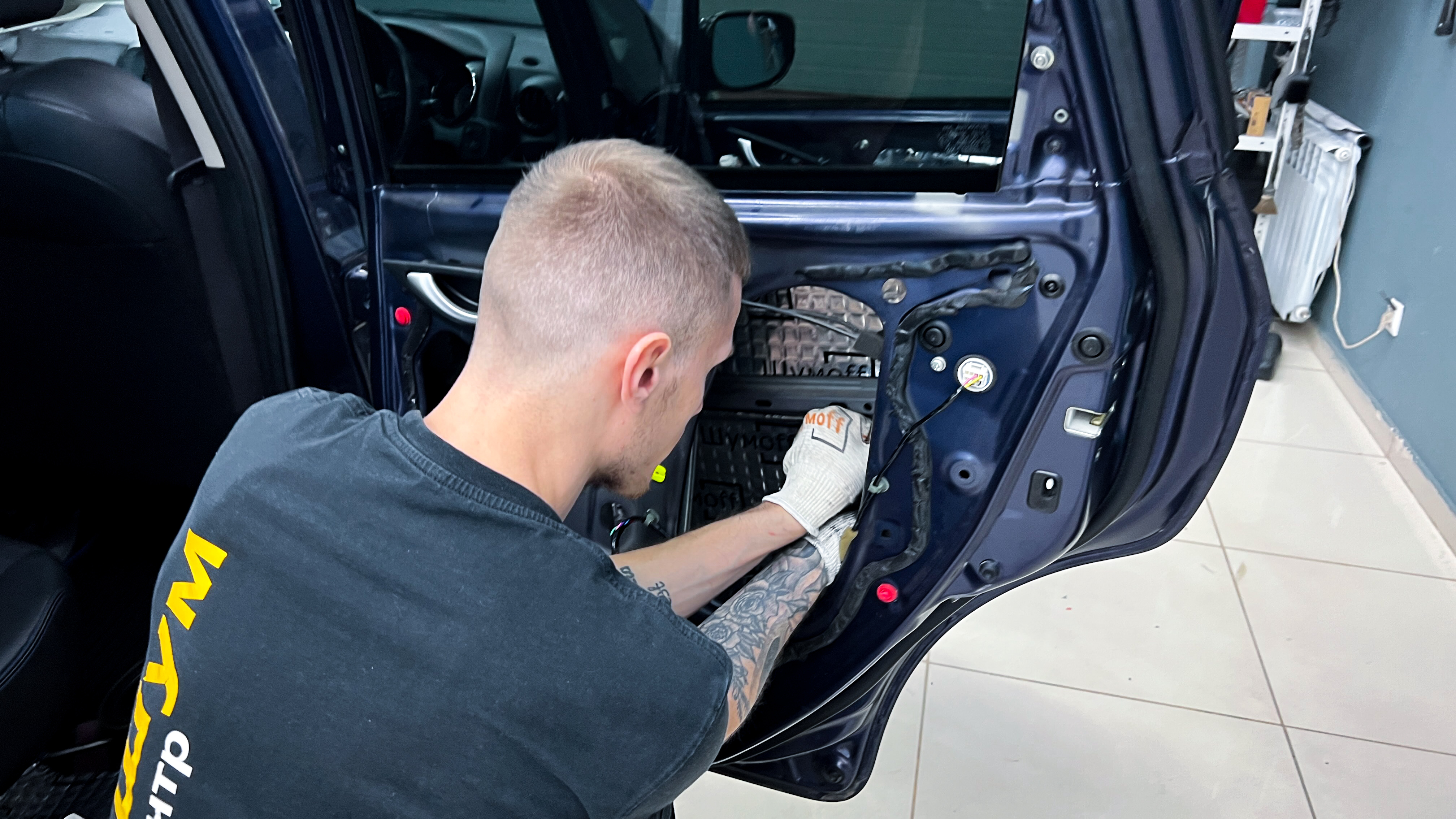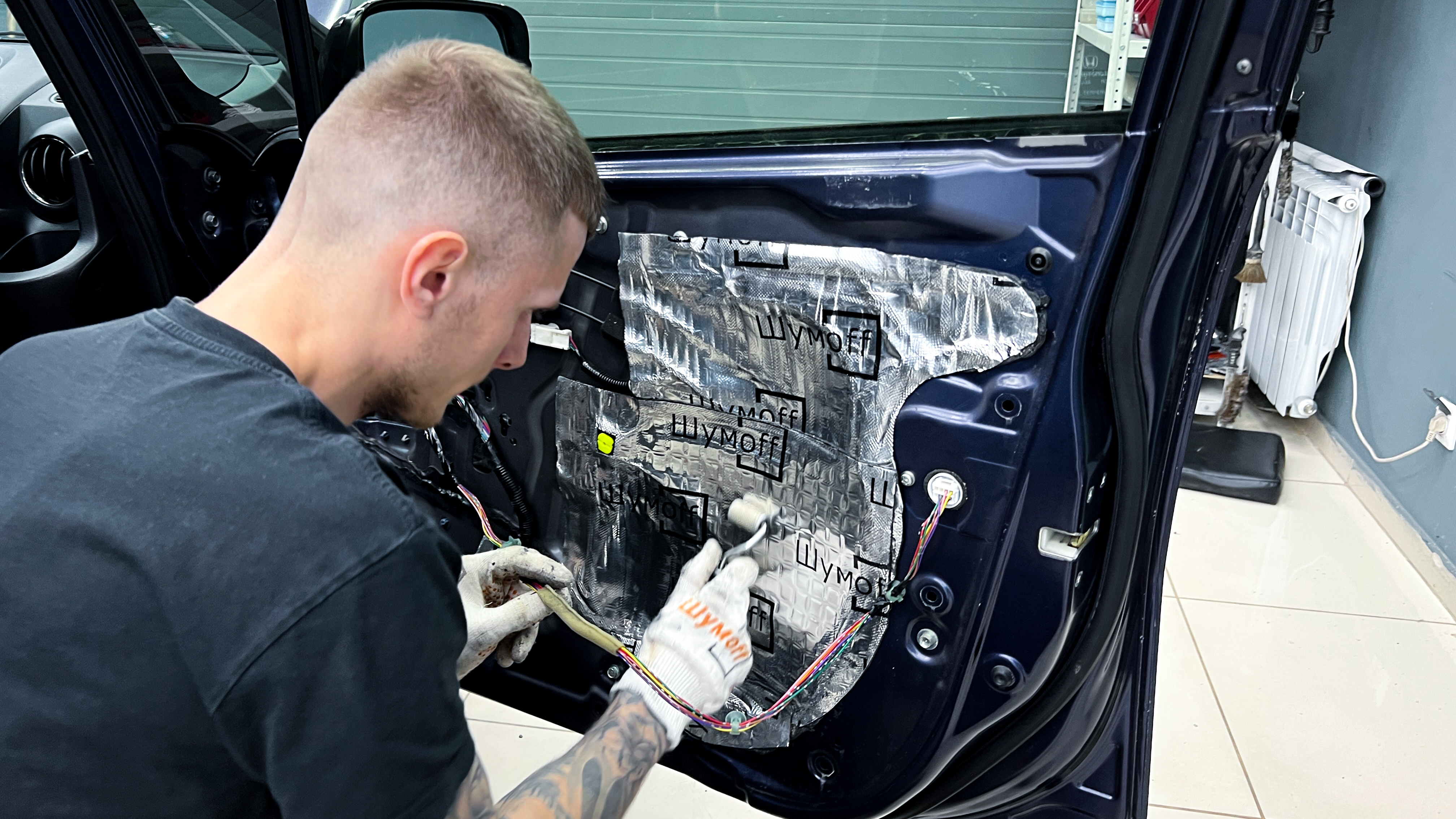 Переходим к дверной обшивке. Убираем штатную шумоизоляцию иобезжириваем поверхность. Всю внутреннюю поверхность оклеиваем мощным шумопоглотителем Шумофф Absorber А15.
