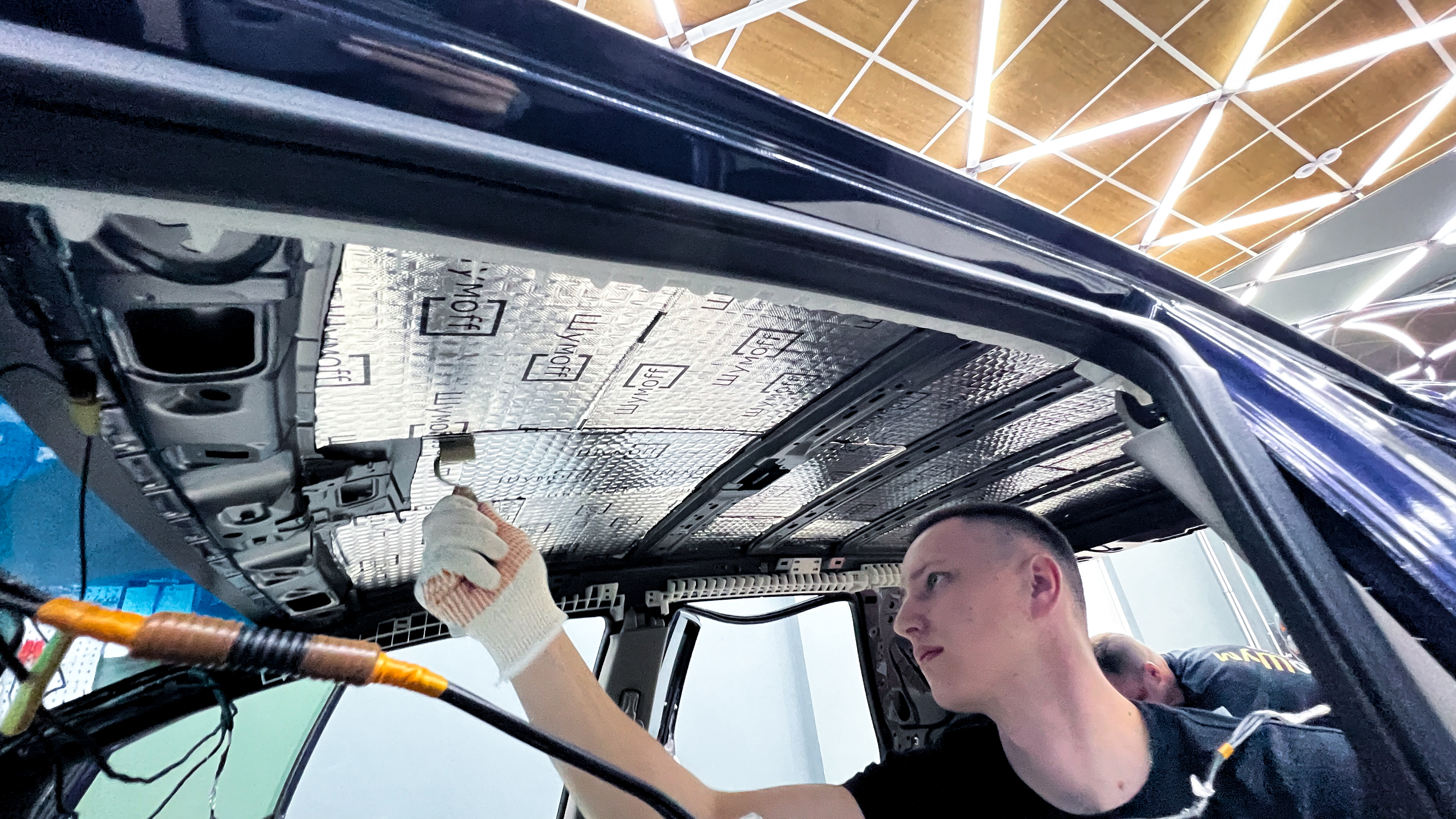 Завершаем шумоизоляцию нанесением третьего слоя звукоизоляционной мембраны Practik Finish на арки. В результате получаем компоновку материалов с максимальной эффективностью и возможностью сборки салона в первозданный вид.