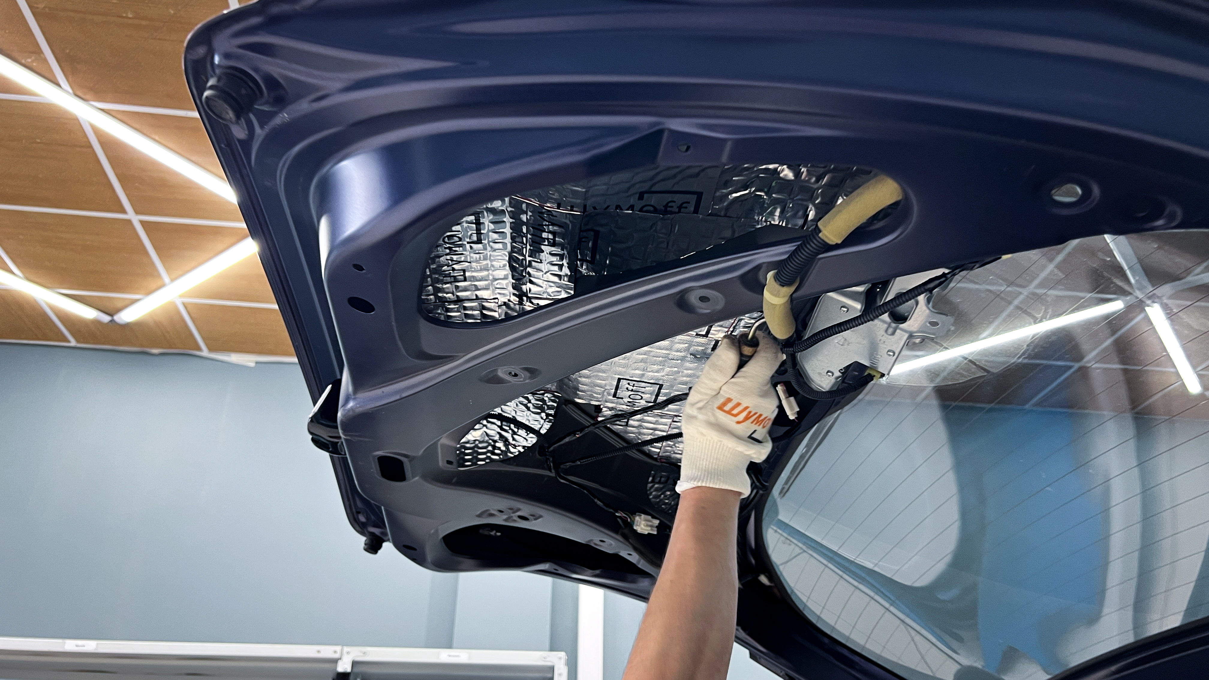 На арки клеим также Шумофф М3, а для крыльев используем менее тяжелый М2. Оклеиваем максимальную площадь багажника за исключением усилителей и ребер жесткости. Данная компоновка материалов позволит идеально достичь нужной эффективности при минимальном увеличении веса, что вместе с виброизоляцией пола также поможет нам снизить вибрацию от дороги, увеличить целостность и сбитость авто.