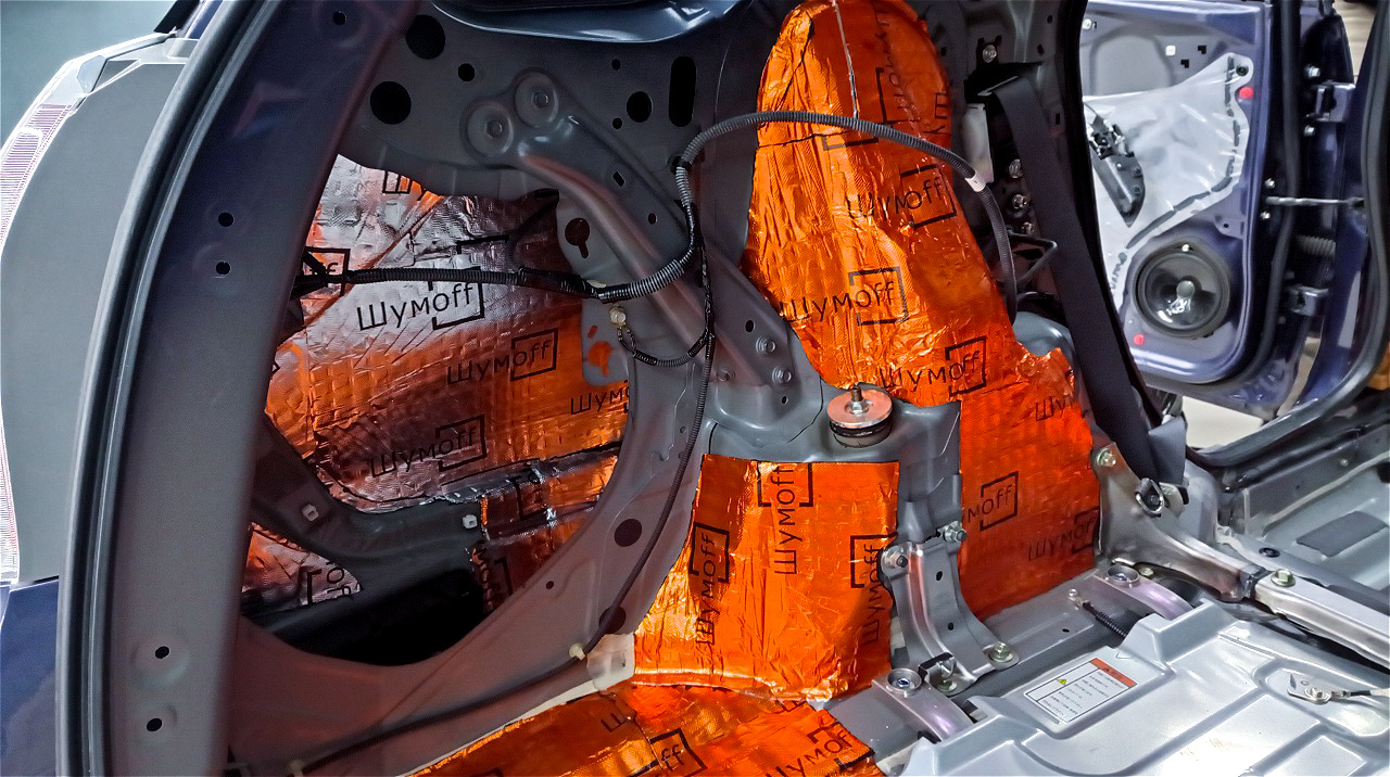 Дно багажника и крылья оклеиваются шумо и теплоизолятором Шумофф П4 4. Арки оклеиваются шумопоглотителем Flex A15.