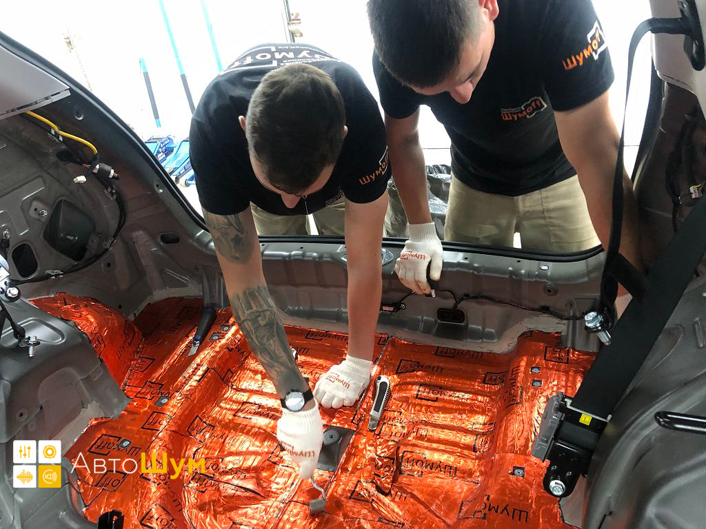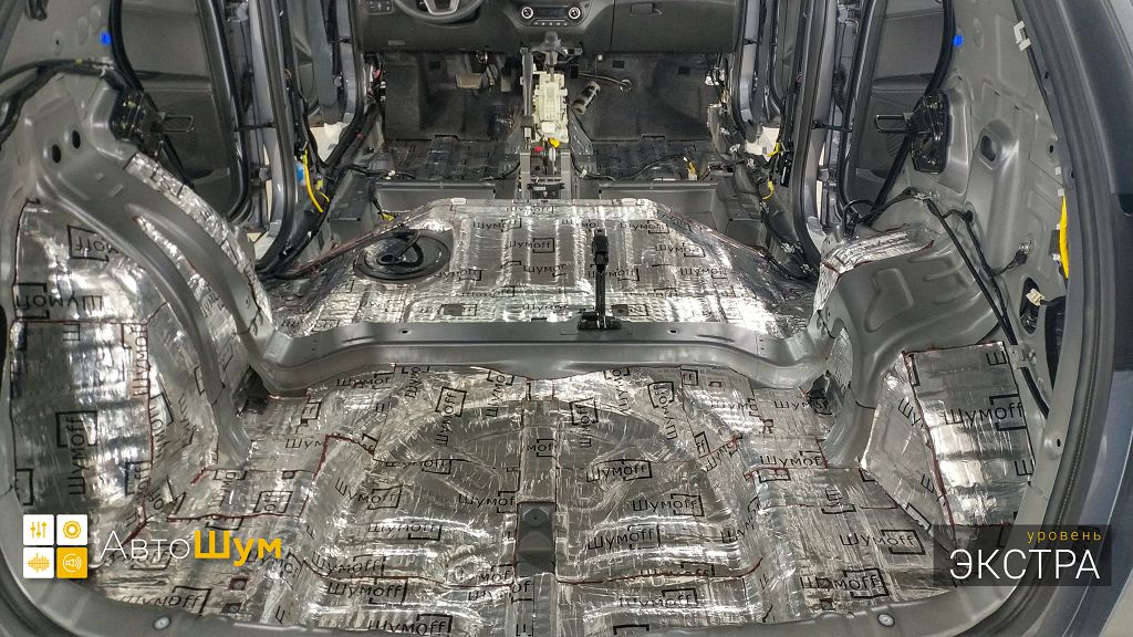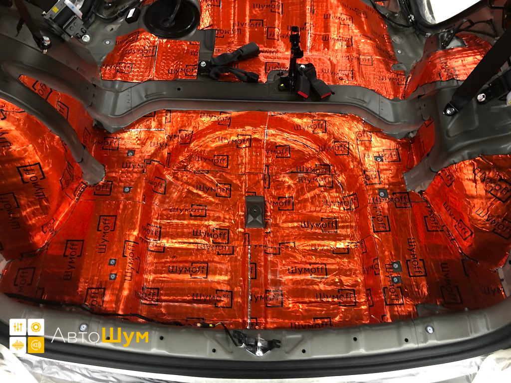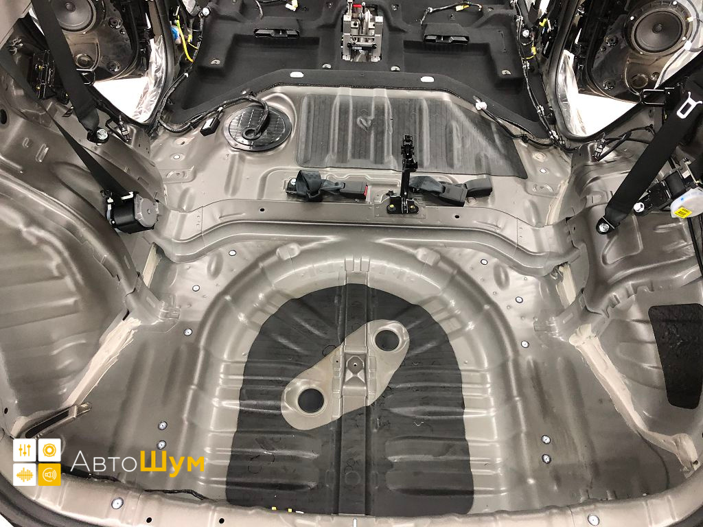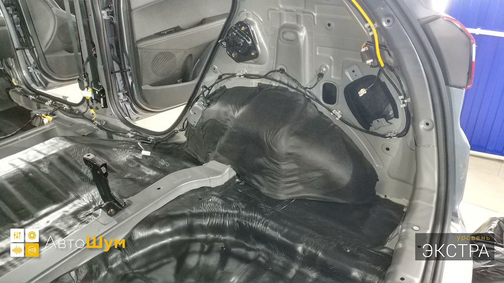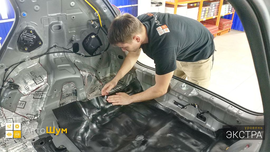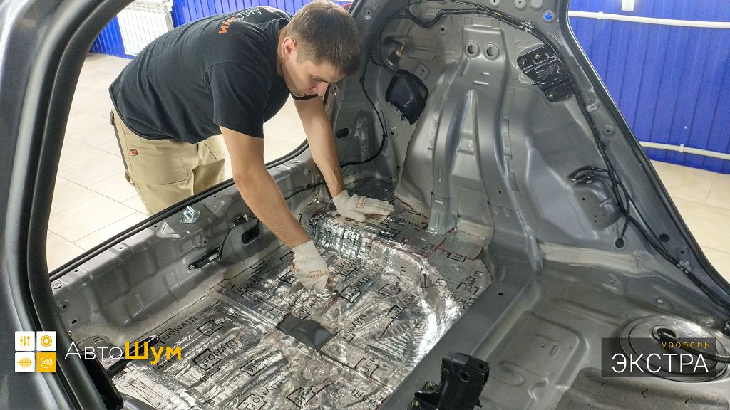 Дно багажника и крылья оклеиваются шумо и теплоизолятором Шумофф П4 4. Арки оклеиваются шумопоглотителем Flex A15.