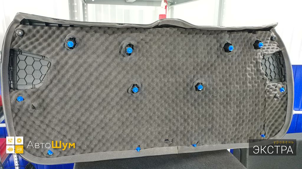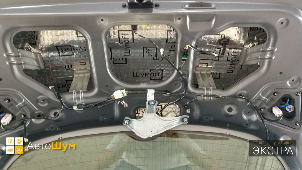 Крышку багажника оклеиваем виброизоляцией Шумофф L2, это позволит свести увеличение ее веса к минимуму, дабы не возникло проблем с открыванием багажника.
