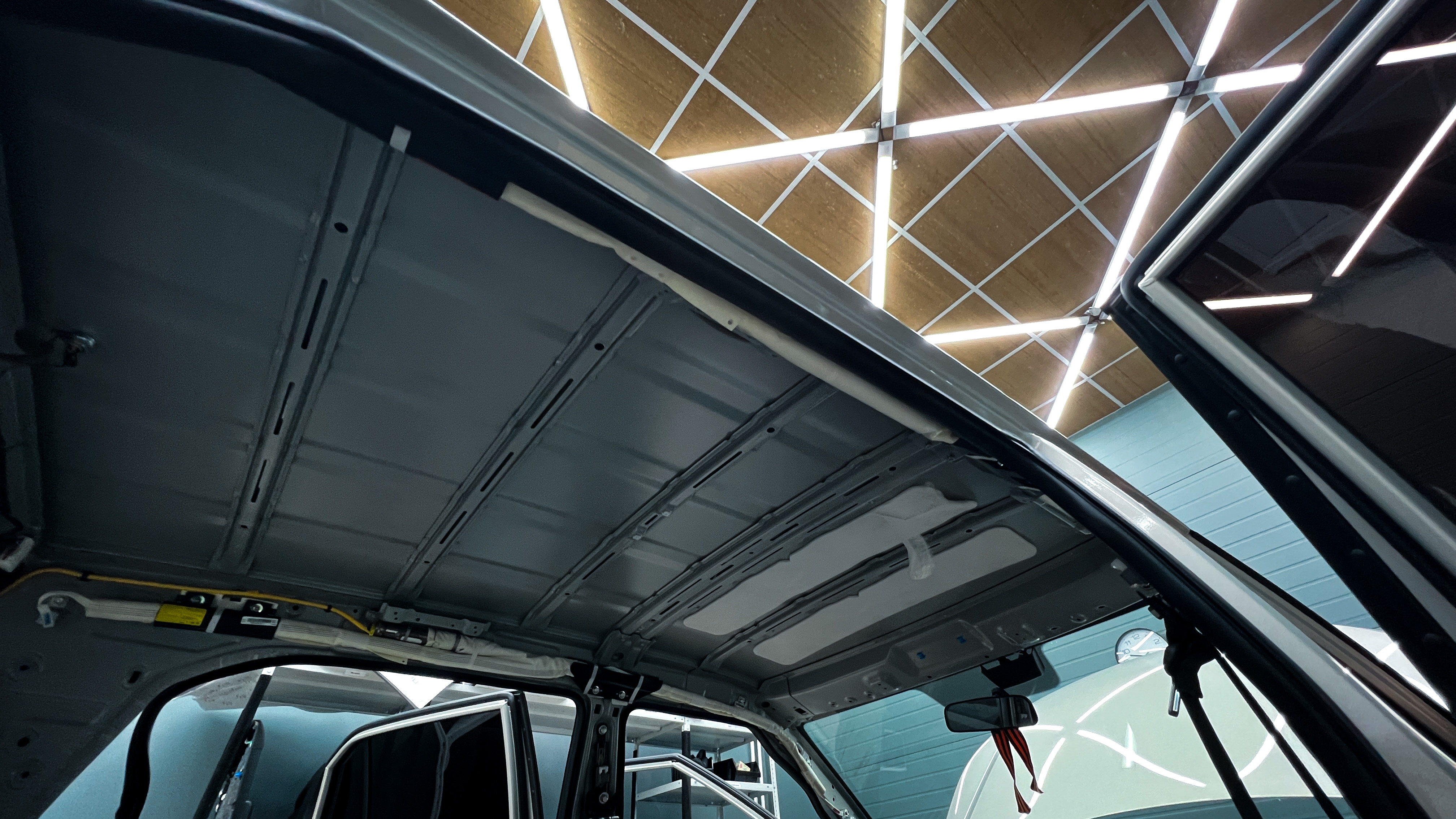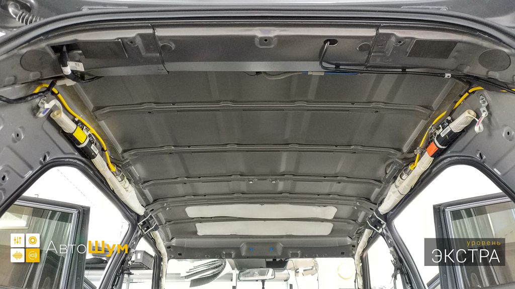 Штатная шумоизоляция крыши на Hyundai Creta (Хёндай Крета) полностью отсутствует. Обезжириваем поверхность для начала монтажа виброизоляции.
