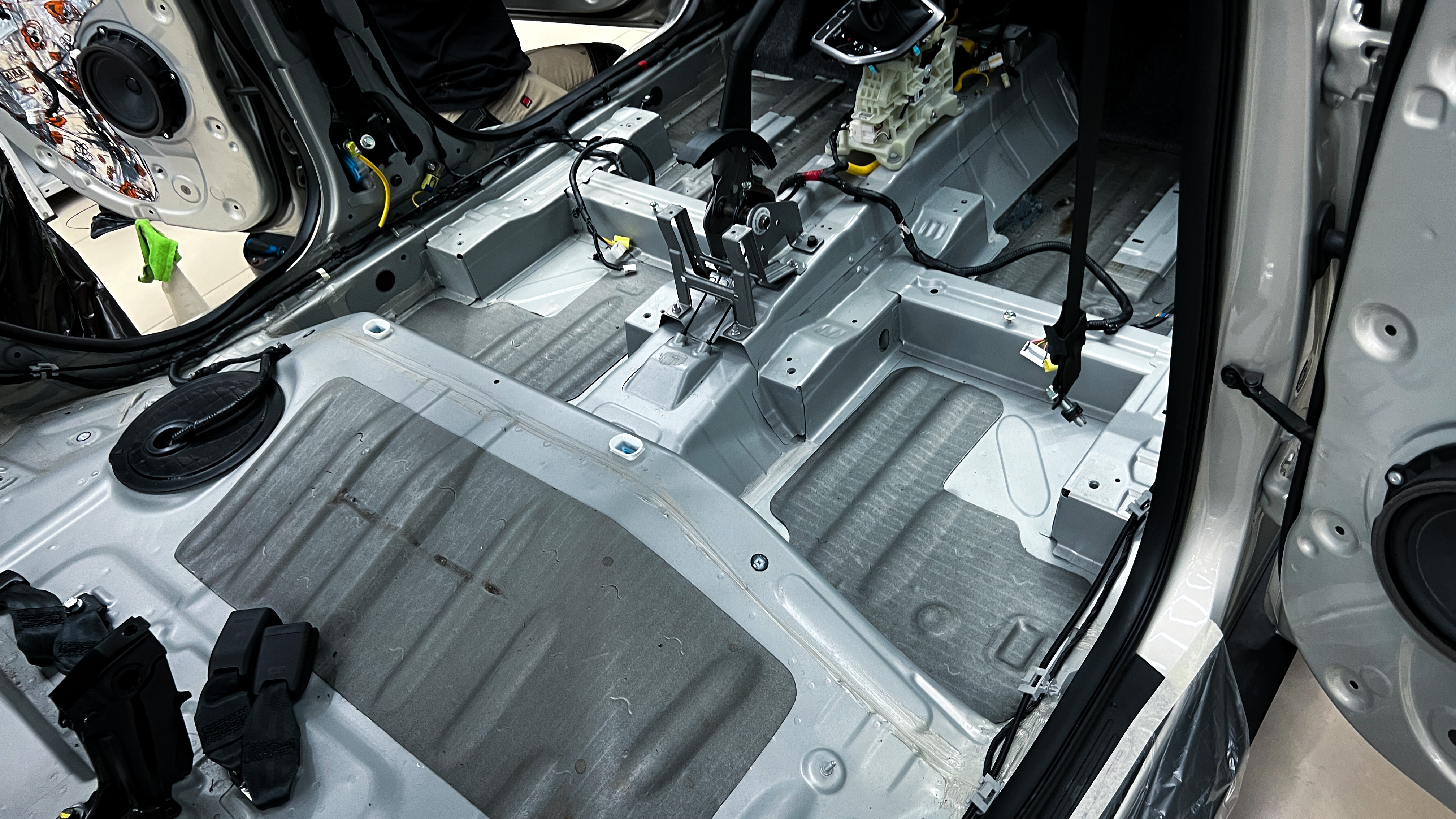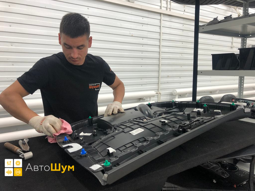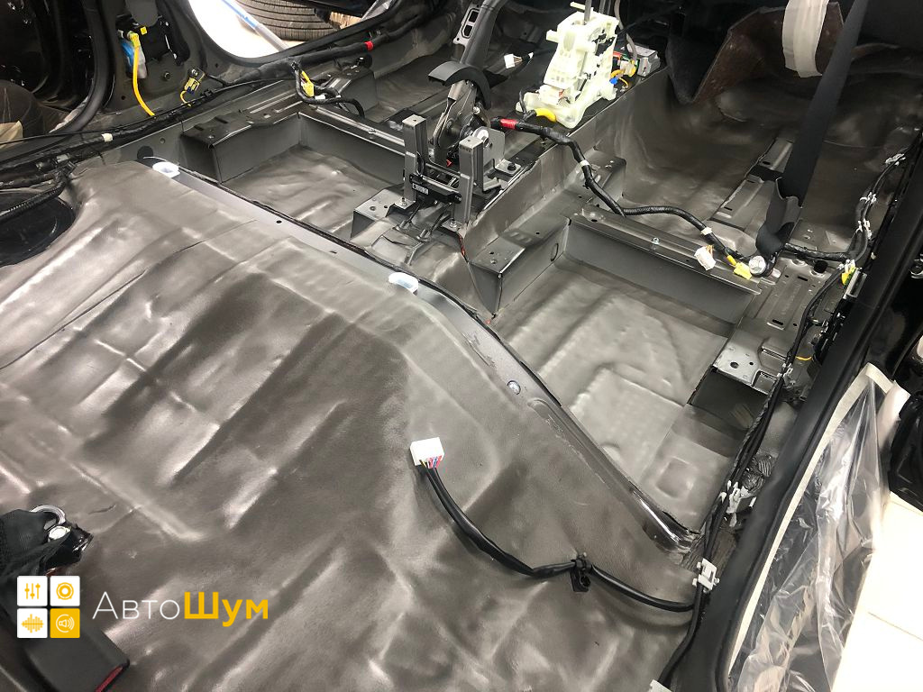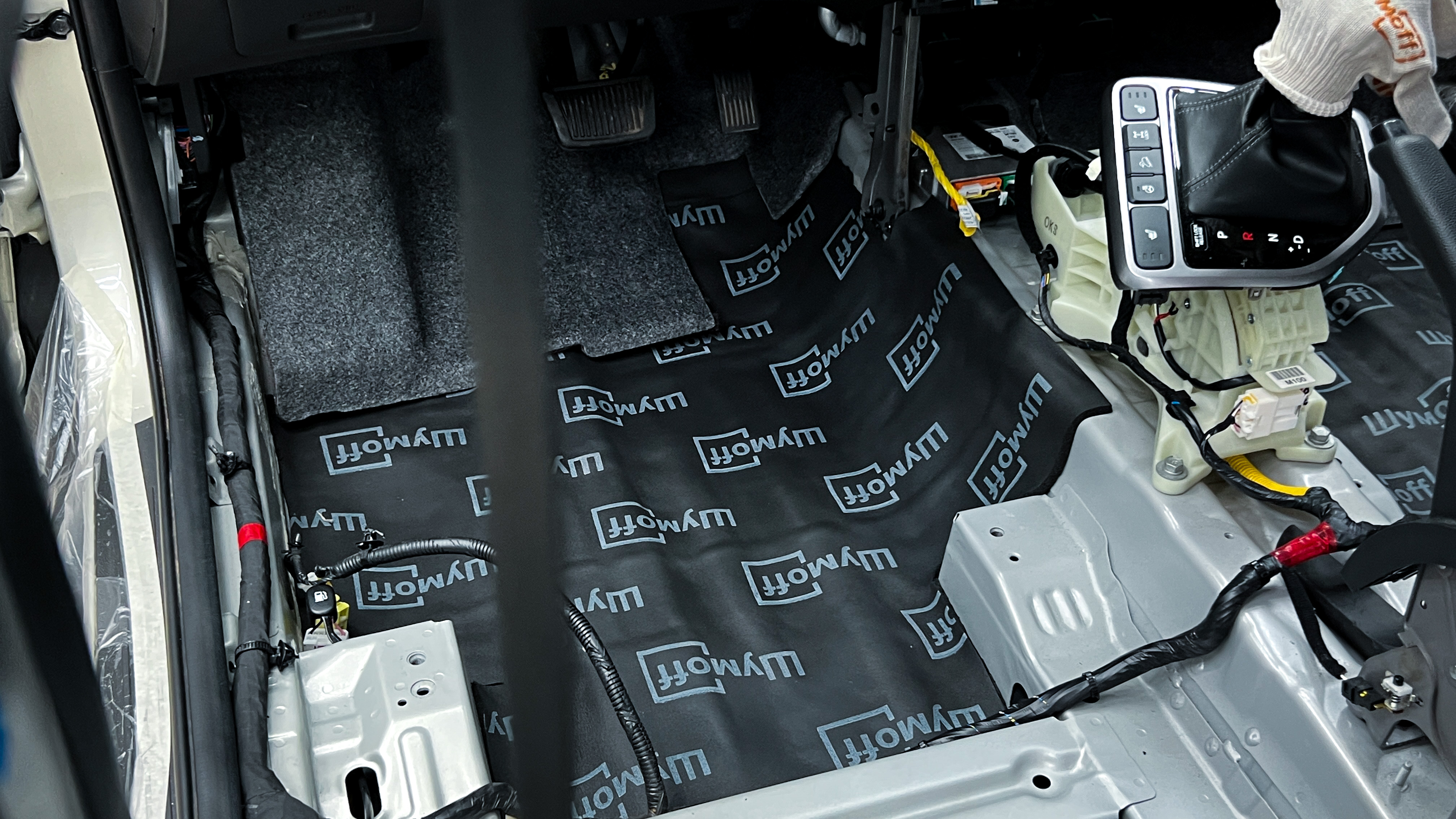 От моторной перегородки и до заднего сиденья вмести с ним клеится мощный многослойный шумо и звукоизолятор Шумофф Prizma 6.