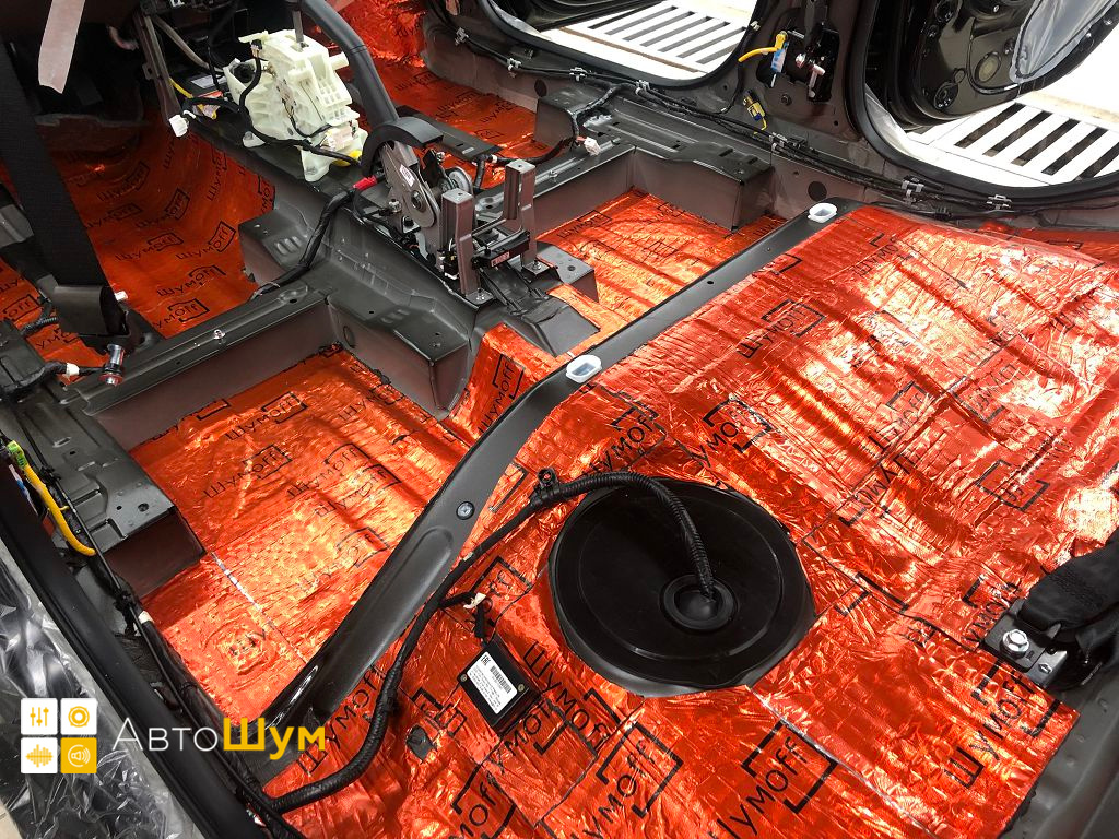 Пол от моторной перегородки и до заднего сиденья оклеивается толстой виброизоляцией Шумофф Super Jack. Под заднее сиденье клеится виброизоляция Шумофф Black Jack.