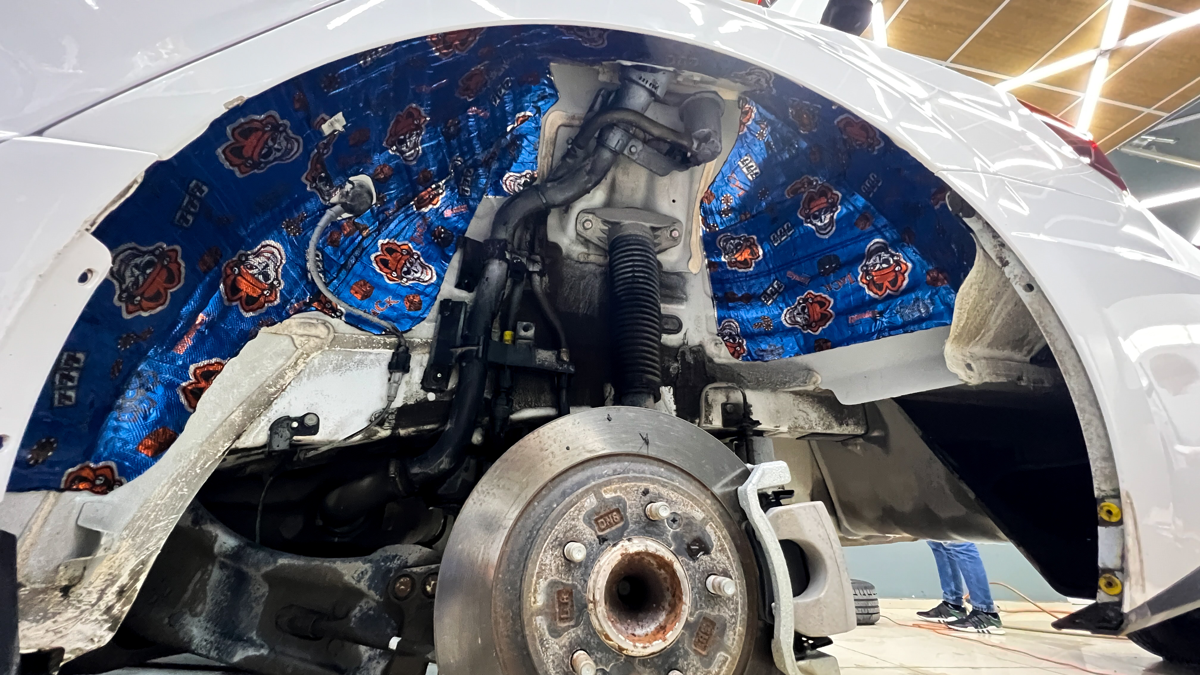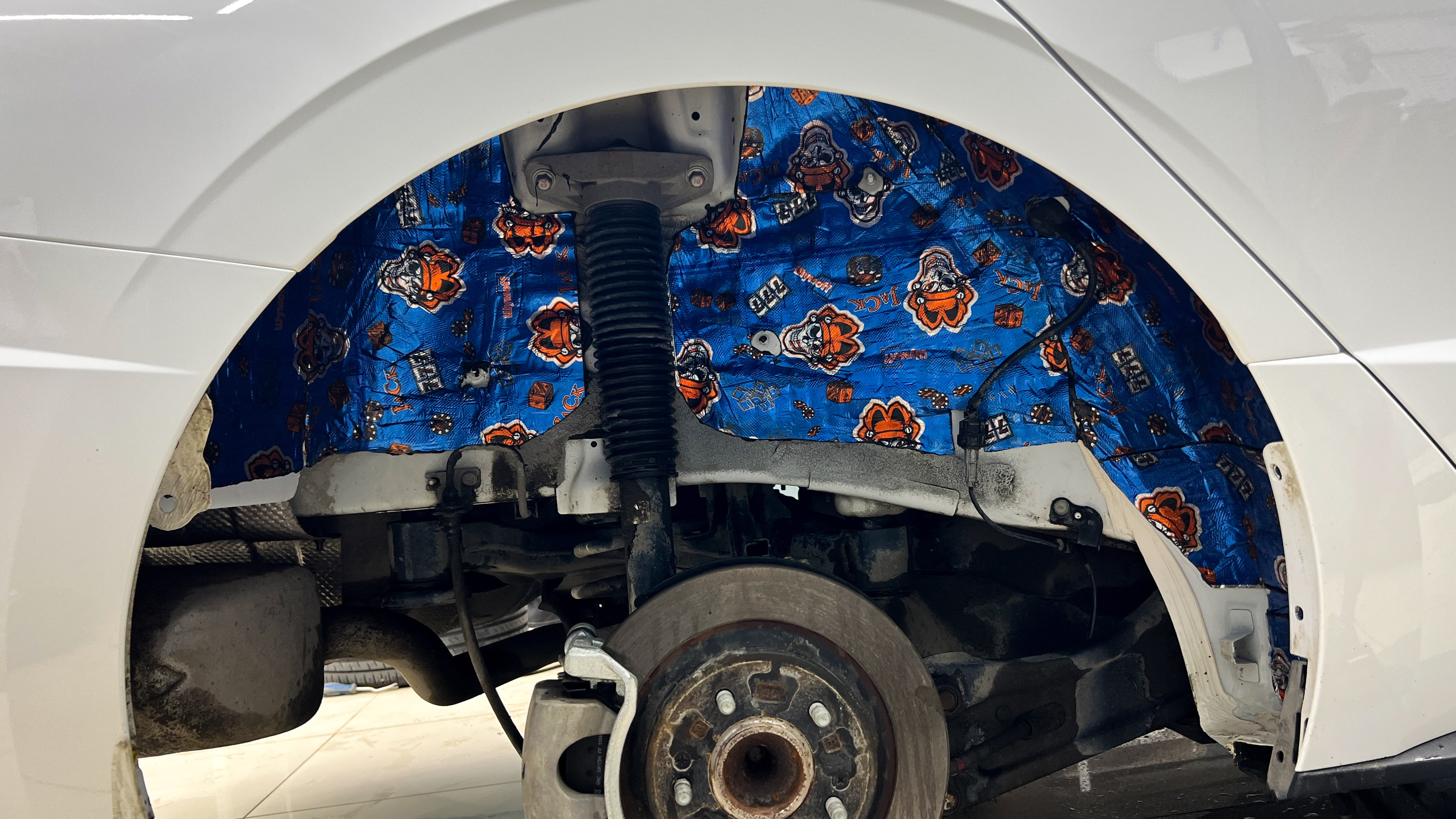 Приступаем к шумоизоляции арок автомобиля. Снимаем колеса и подкрылки. Тщательно зачищаем и обезжириваем область оклейки у арок. Приступаем к монтажу виброизоляции. Первым слоем на металл арки наносим толстую и эффективную виброизоляцию Шумофф М4. Перед нанесением, для более сильной адгезии материал прогревается в специальной печи.