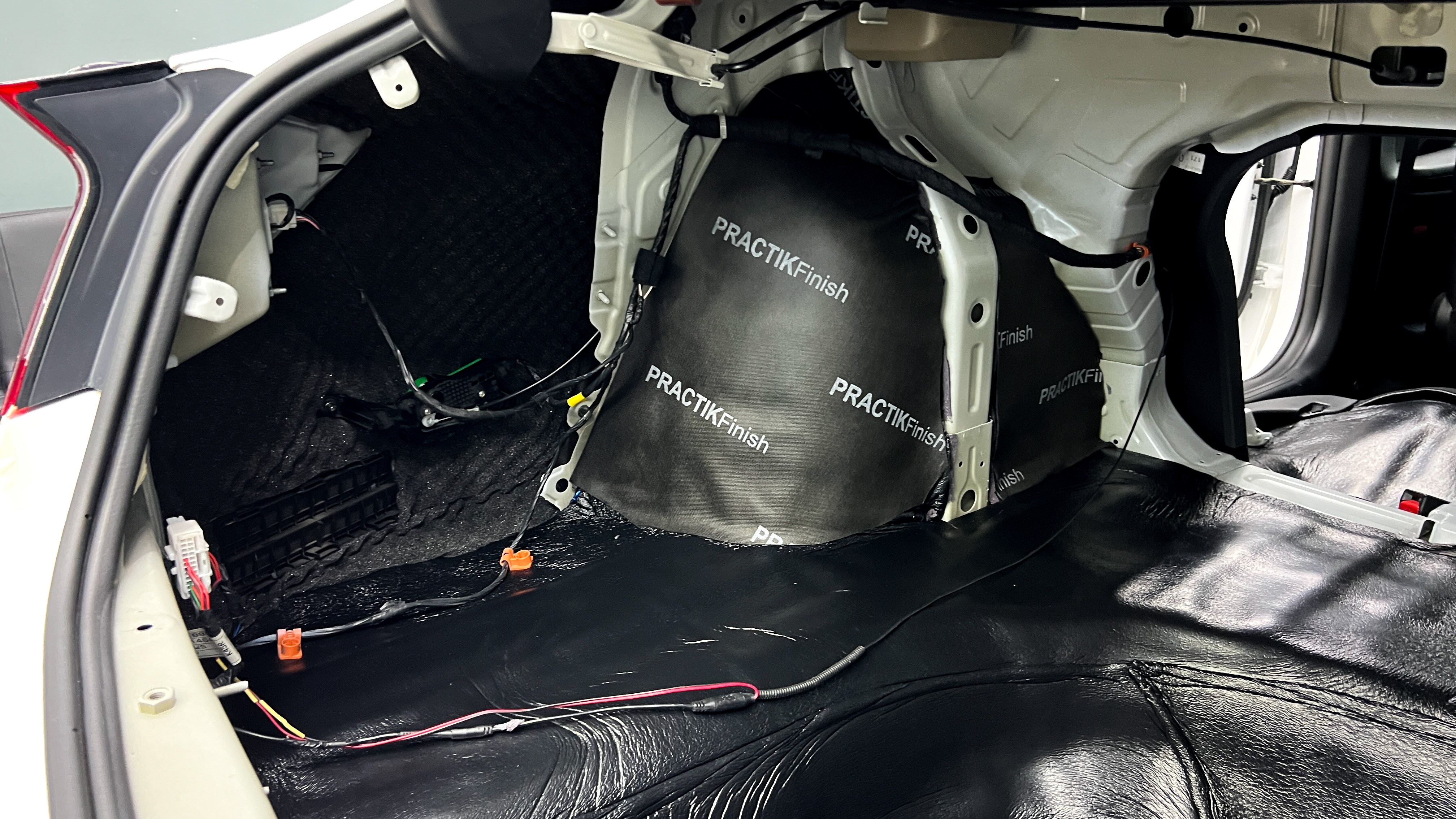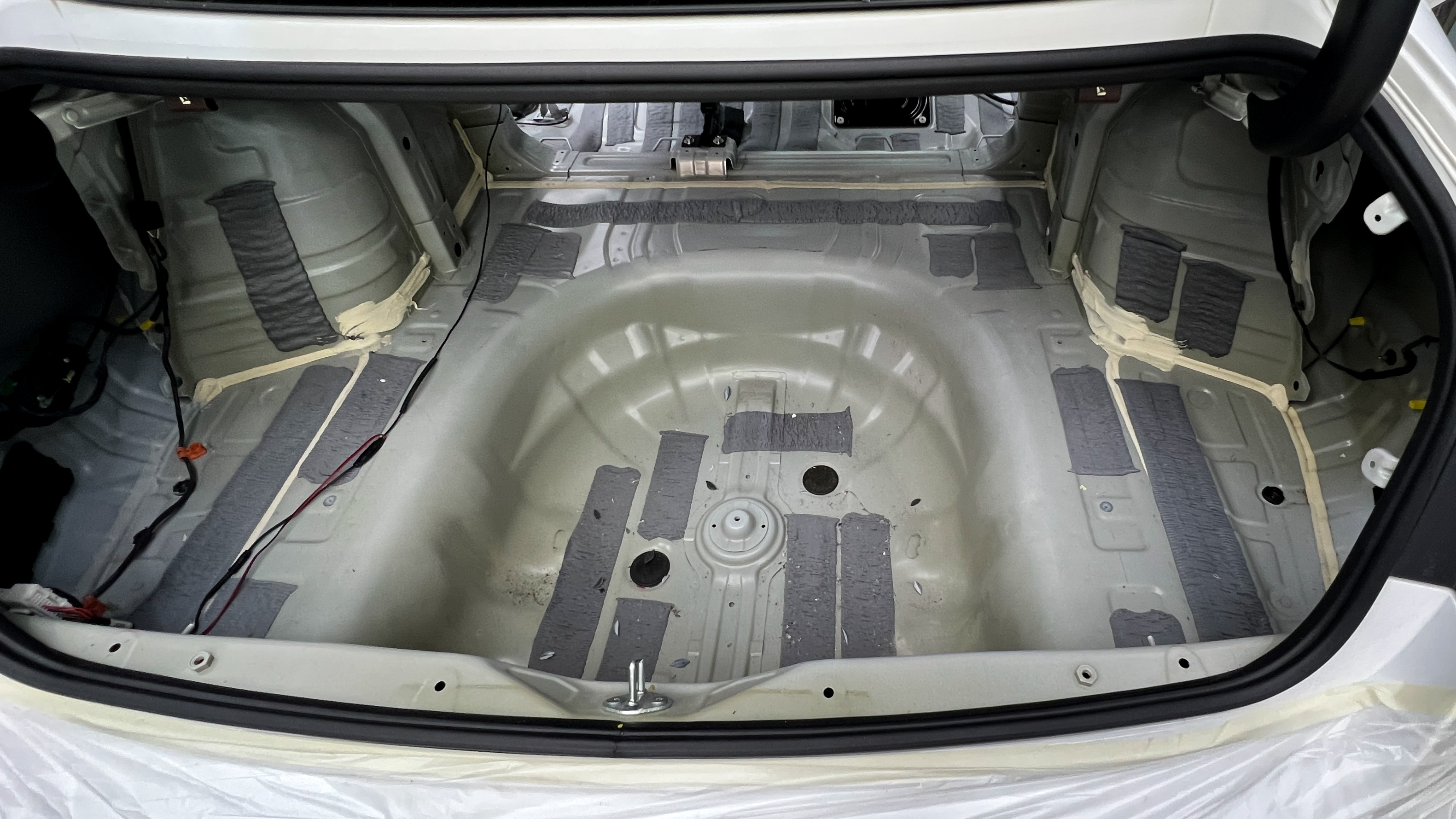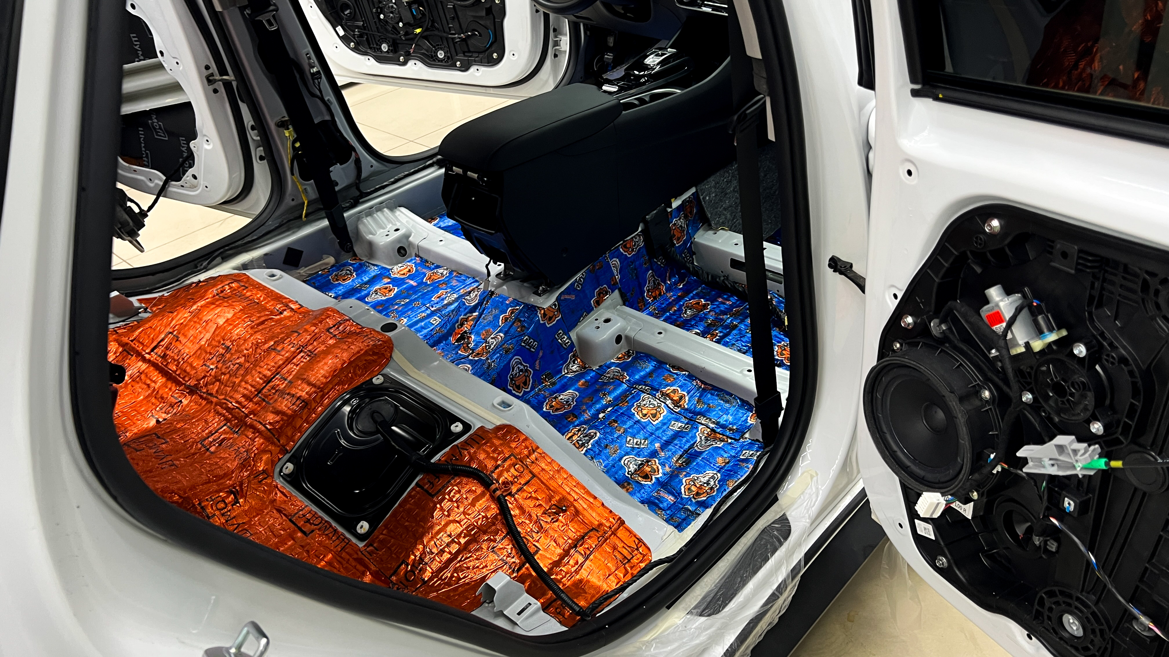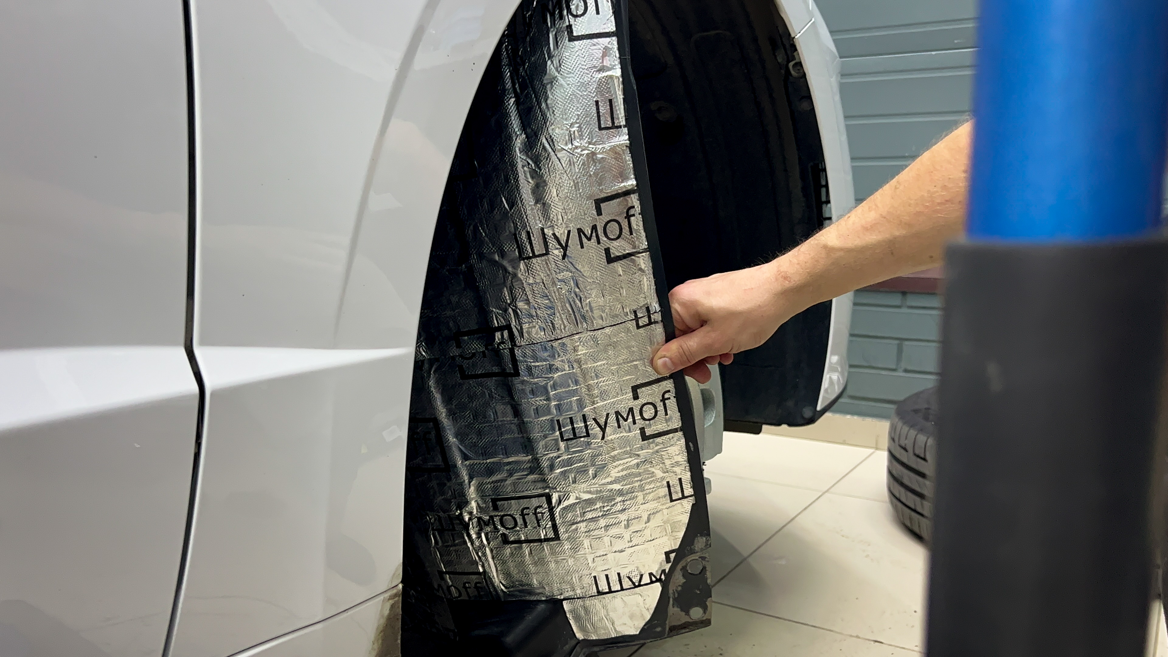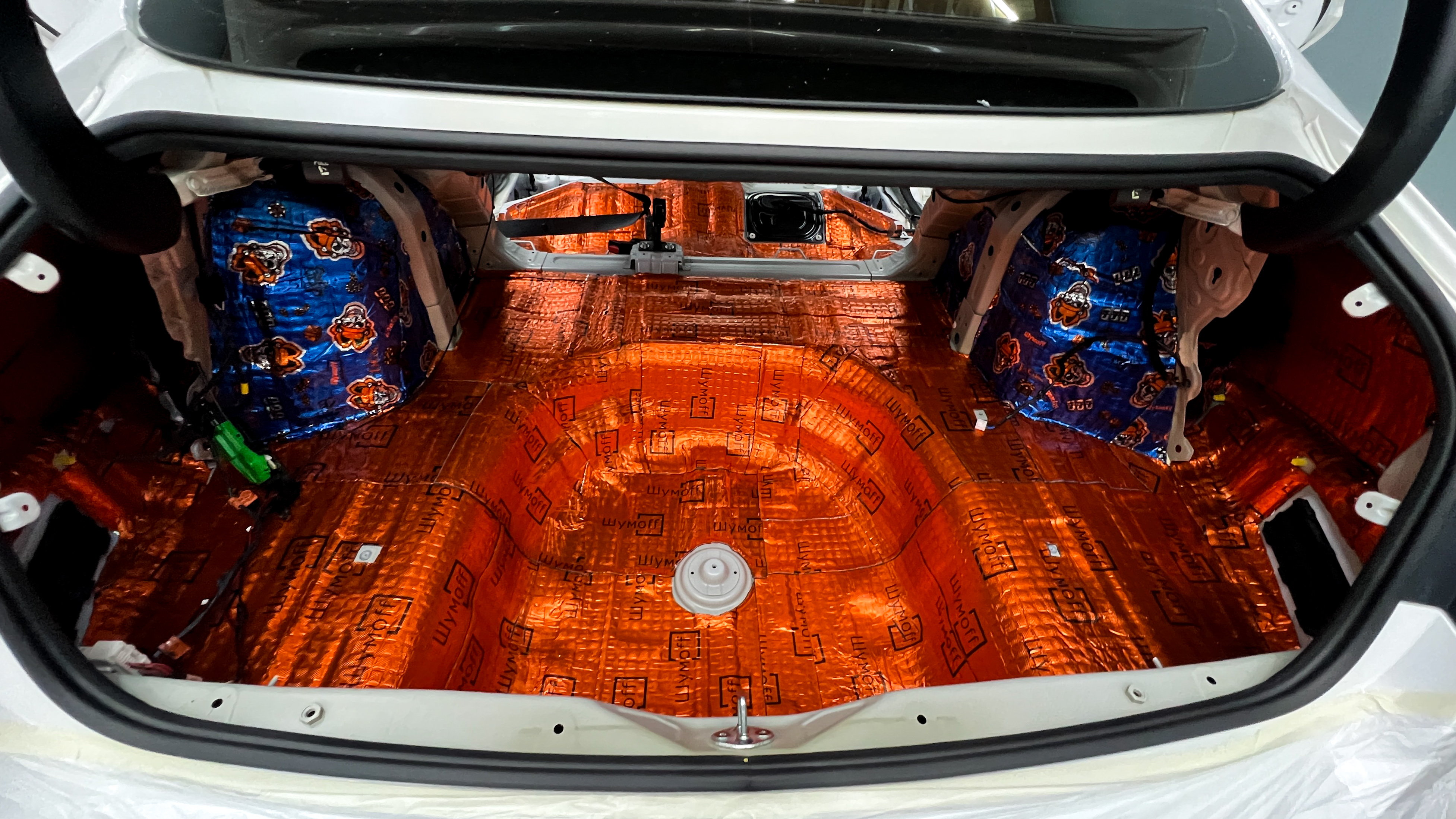 Дно багажника и крылья оклеиваются шумо и теплоизолятором Шумофф П4 4. Арки оклеиваются шумопоглотителем Flex A15.