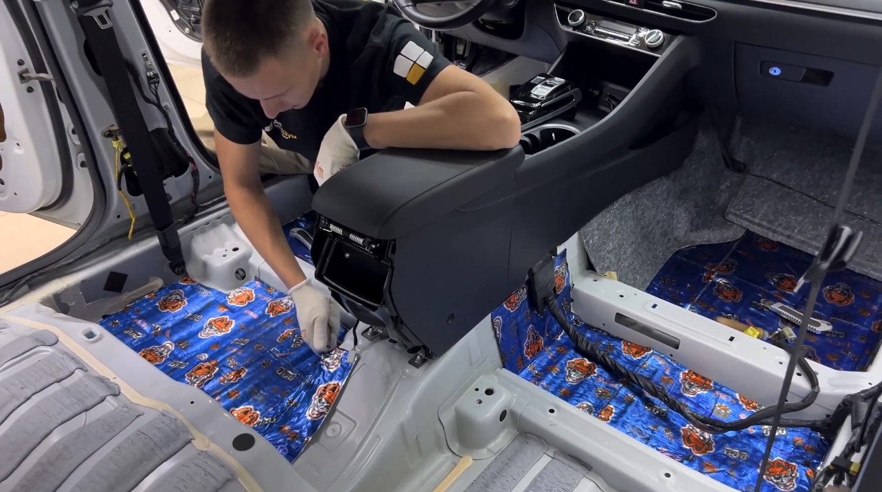 От моторной перегородки и до заднего сиденья вмести с ним клеится мощный многослойный шумо и звукоизолятор Шумофф Prizma 6.