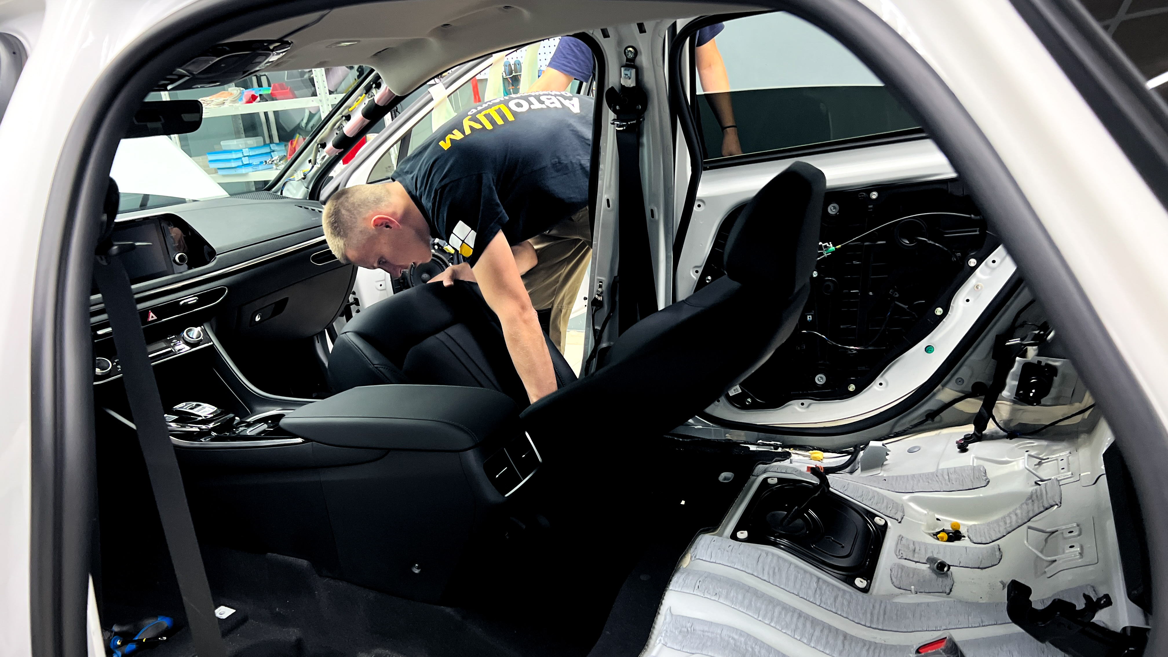 Откручиваем и вынимаем сиденья, пластик и центральную консоль. Все детали салона складываем на специальный стеллаж, что бы сохранить их в первозданном виде.