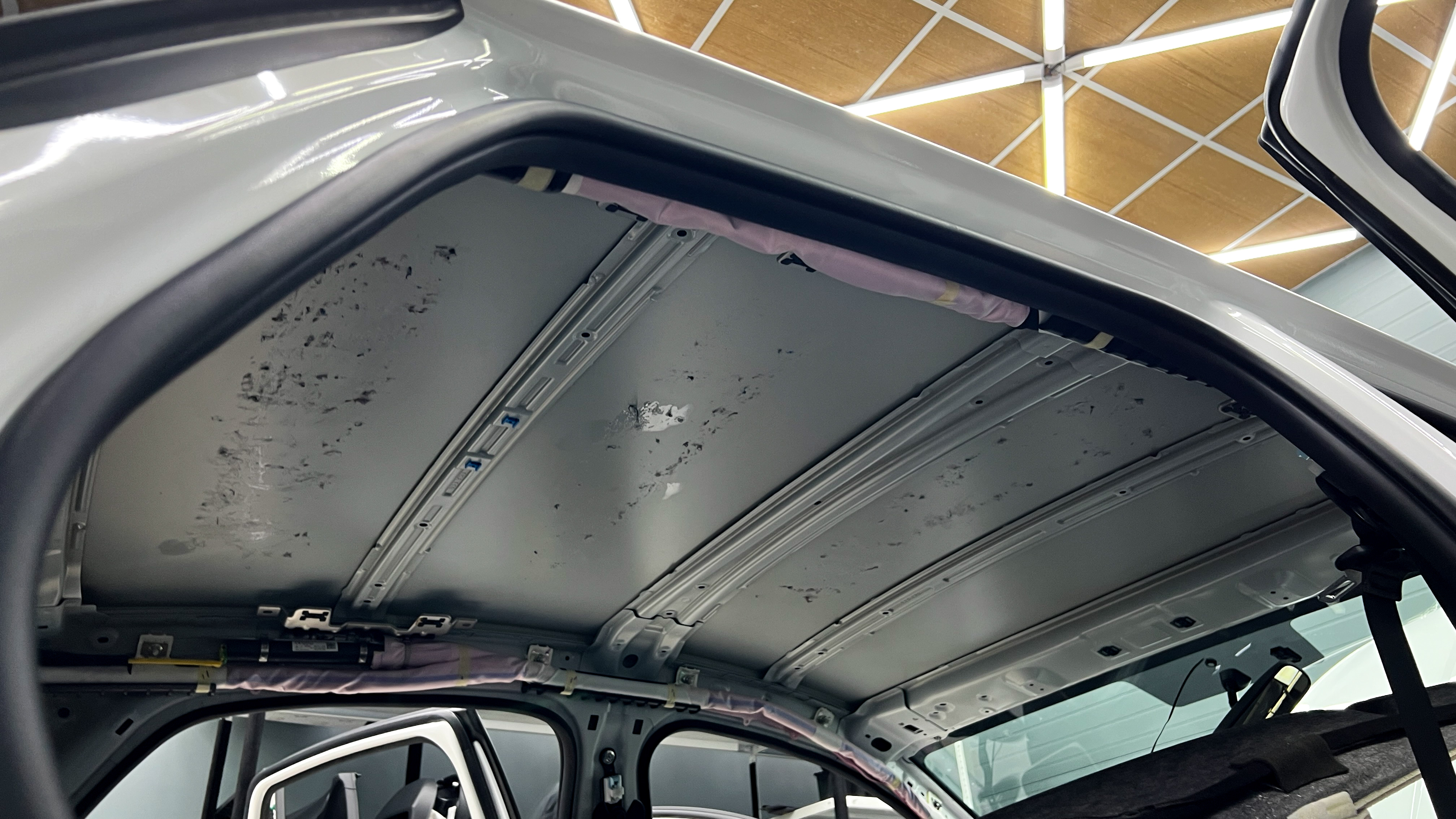 Штатная шумоизоляция крыши полностью отсутствует. Обезжириваем поверхность для начала монтажа виброизоляции.