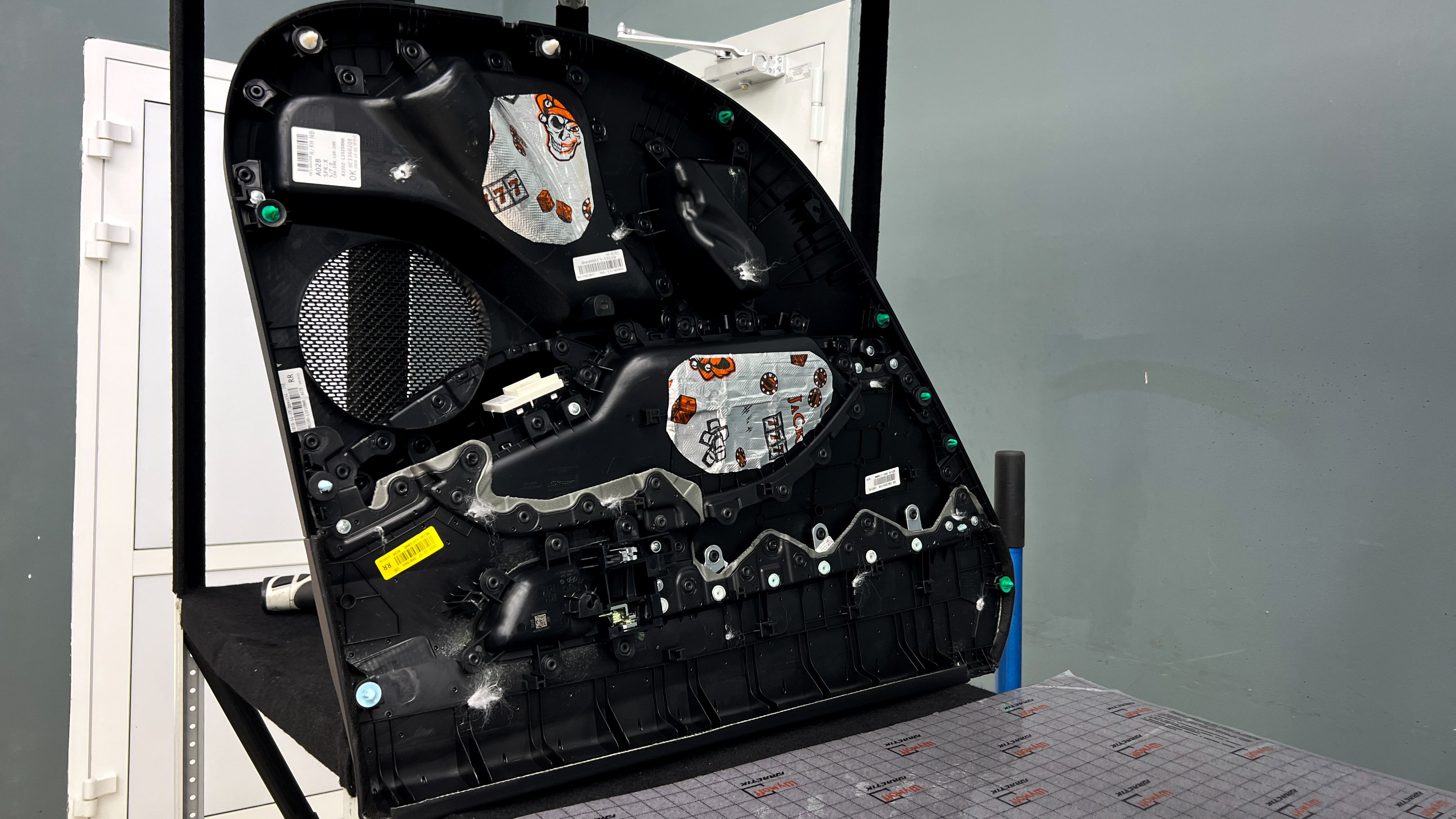 Переходим к оклейке самого корпуса панели, первым слоем частично наносим виброизоляцию Шумофф Joker, создавая тем самым идеальный баланс. Такая частичная оклейка позволит нам чрезмерно не утяжелять панель и придать ей необходимую сбитость