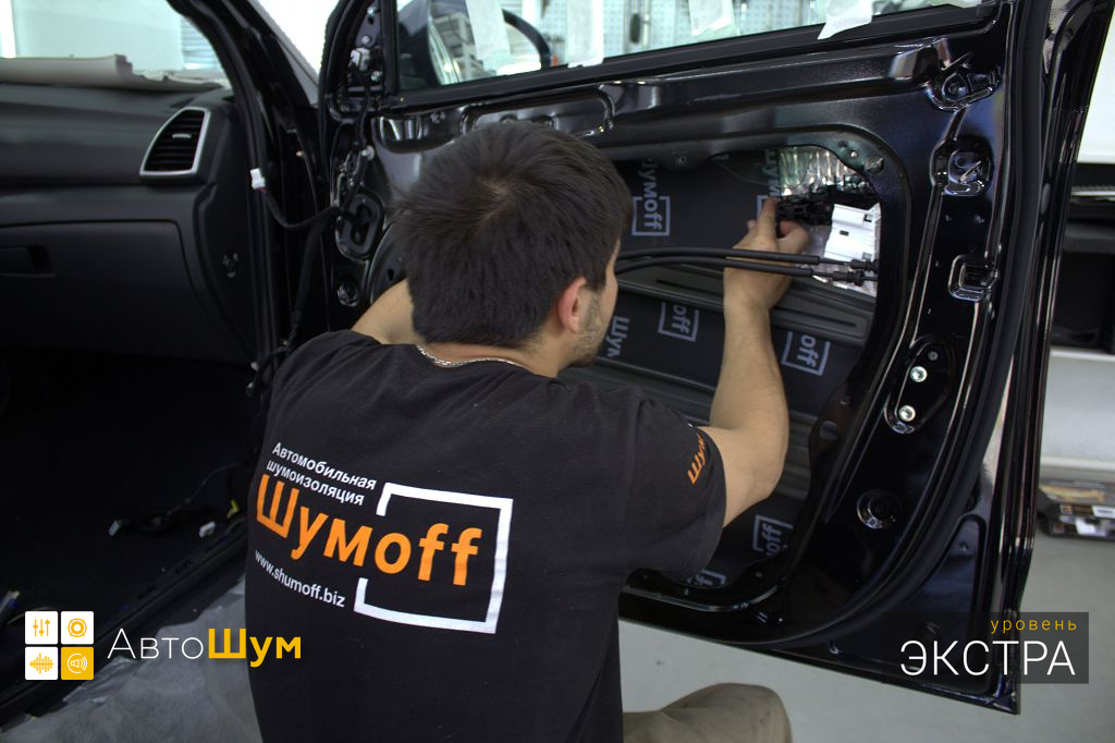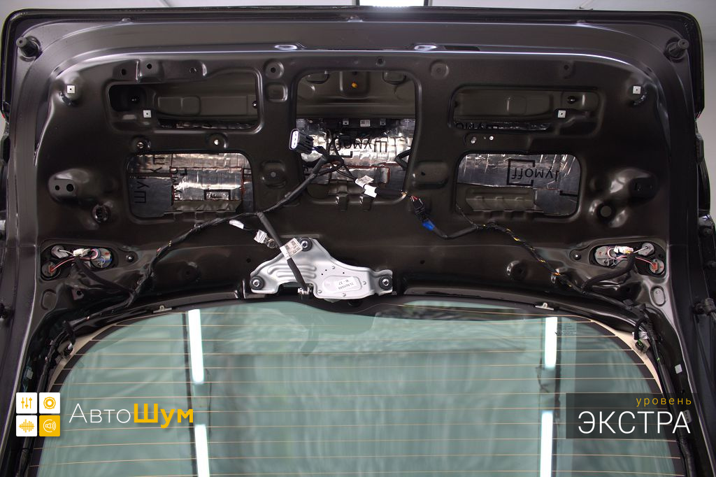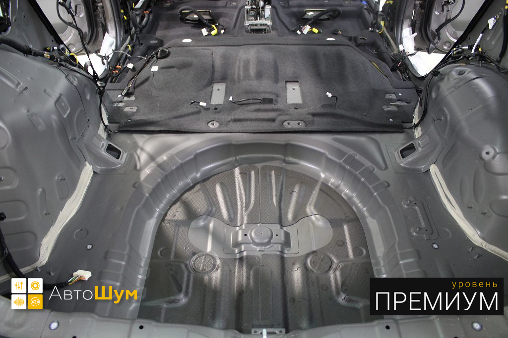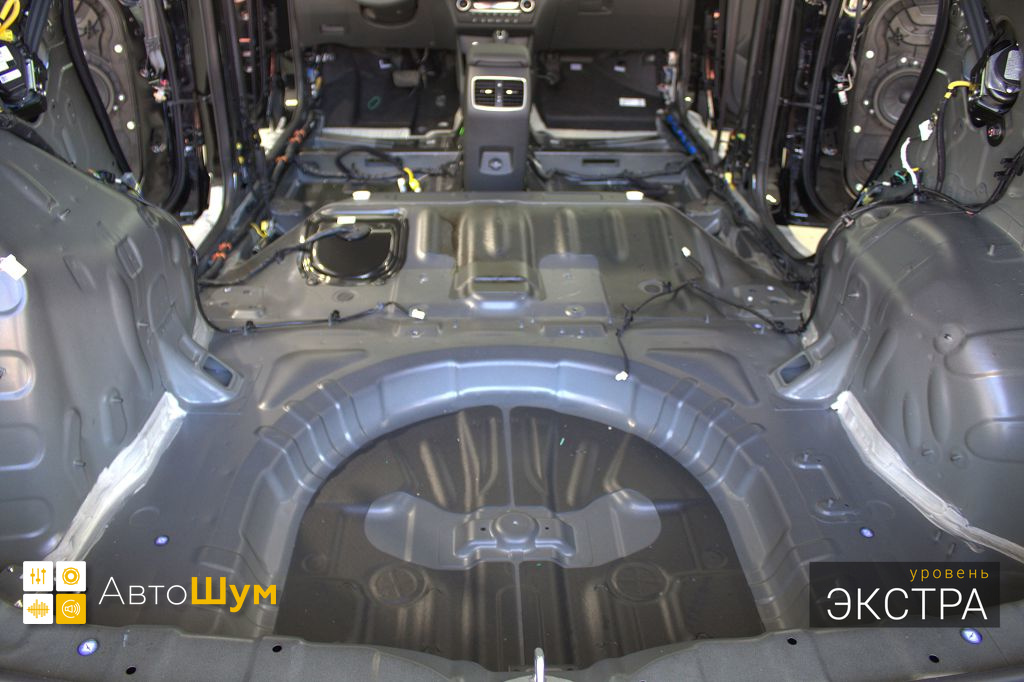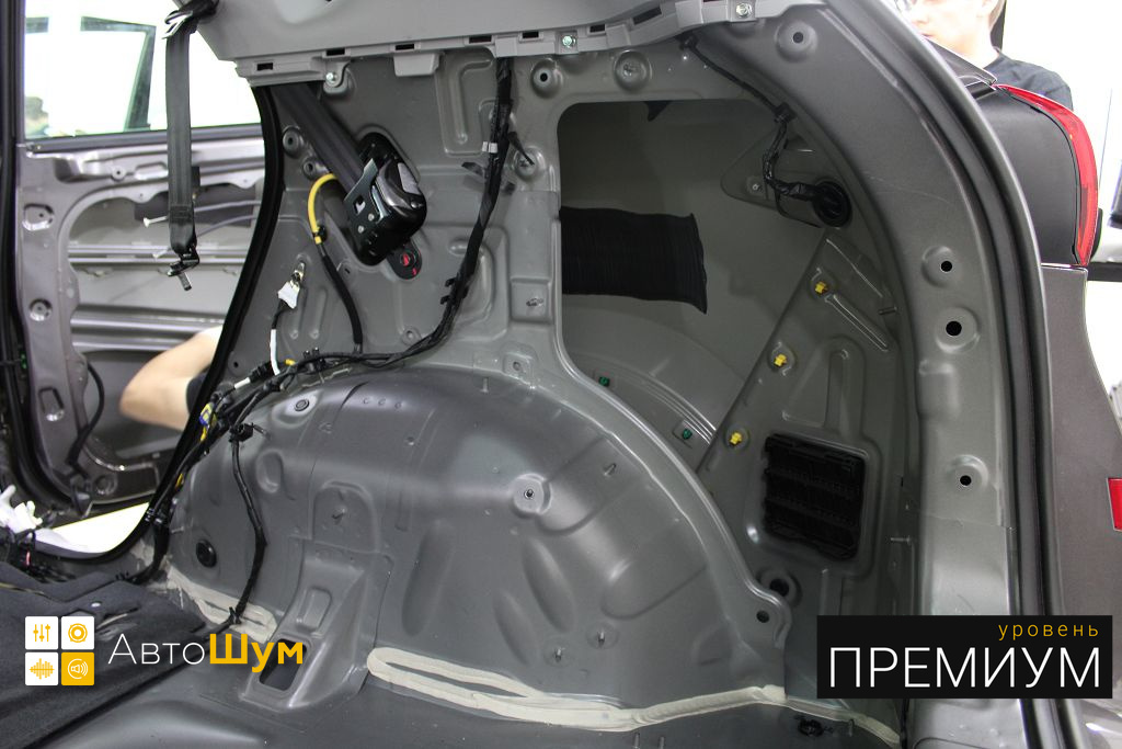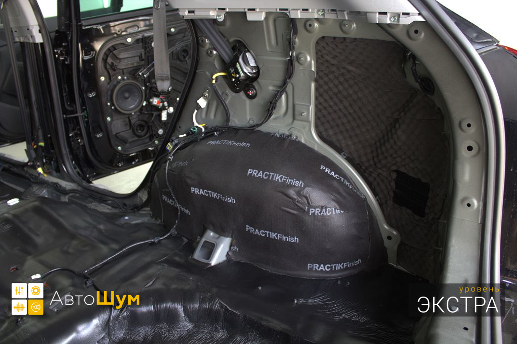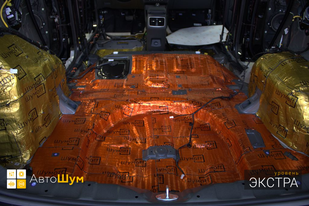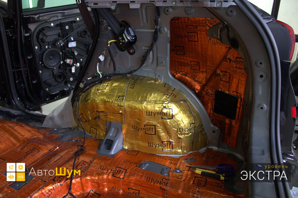 Дно багажника и крылья оклеиваются шумо и теплоизолятором Шумофф П4 4. Арки оклеиваются шумопоглотителем Flex A15.