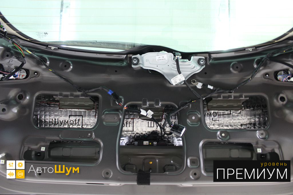 Обшивку пятой двери изнутри оклеиваем так же мощным шумопоглотителем Absorber А15, а по её контуру антискрипным материалом. Тем самым мы помимо еще одного барьера от внешнего шума устраняем возможность всех скрипов и бряков.