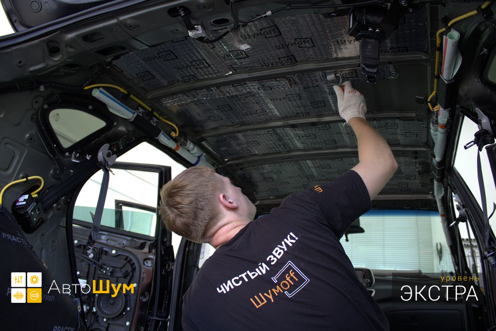 От моторной перегородки и до заднего сиденья вмести с ним клеится мощный многослойный шумо и звукоизолятор Шумофф Prizma 6.