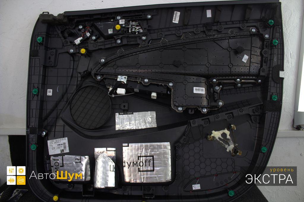 Внутреннюю поверхность дверной обшивки оклеиваем шумопоглотителем Шумофф Absorber А15. По контуру обшивки используем уплотнительный и противоскрипный материал Flex 5.