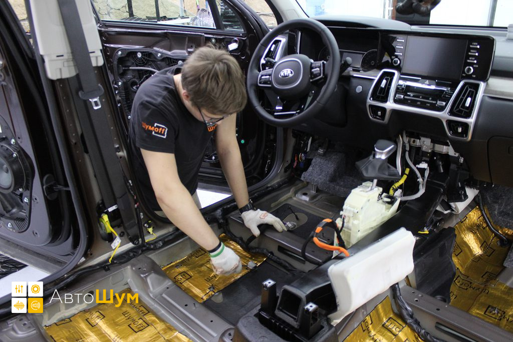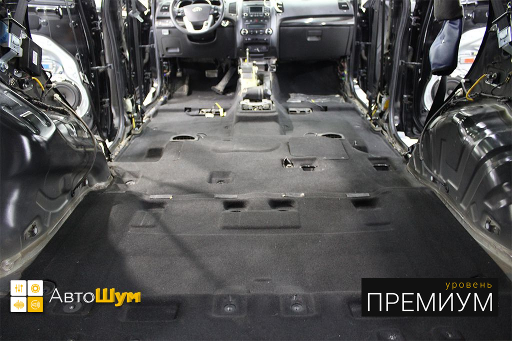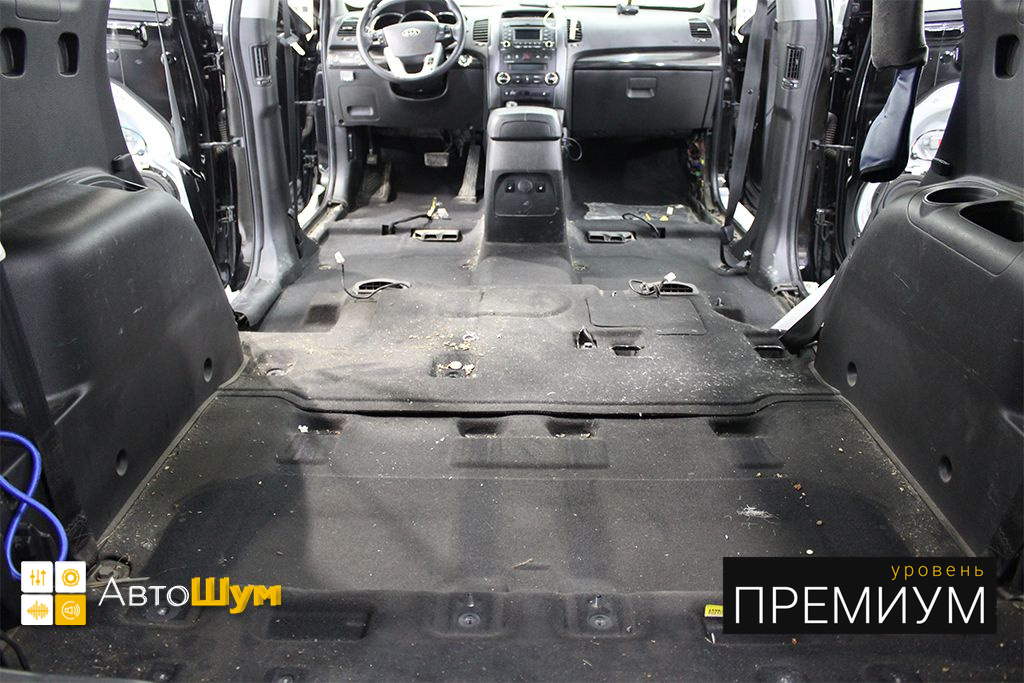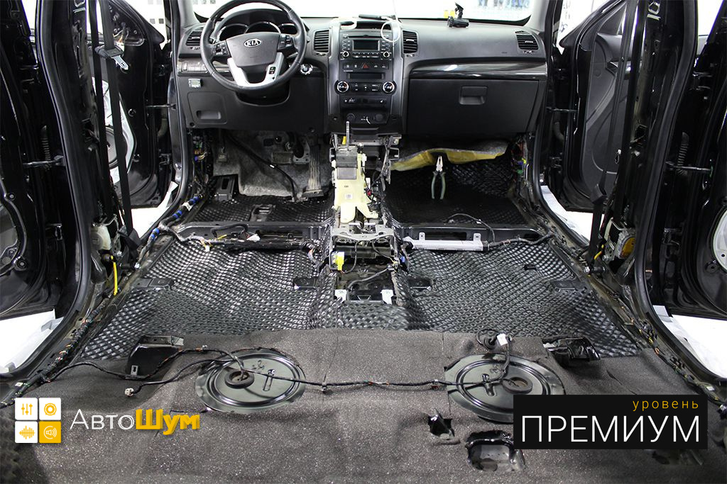 Перед началом шумоизоляции пола на Kia Sorento (Киа Соренто) необходимо проверить качество адгезии заводской виброизоляции к кузову. Она должна хорошо держаться, в противном, случае её необходимо демонтировать.